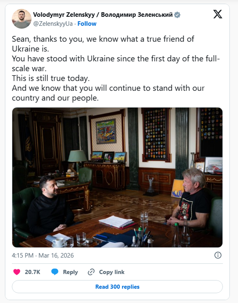 - Seane, zahvaljujući tebi, znamo što znači biti pravi prijatelj Ukrajine. Uz Ukrajinu si od prvog dana rata velikih razmjera. To vrijedi i danas i znamo da ćeš i dalje biti uz našu zemlju i naš narod - napisao je Zelenski.