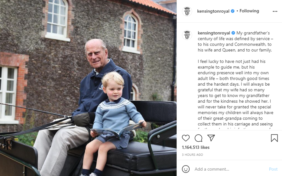 "Stoljeće života mog djeda definirano je služenjem - njegovoj zemlji i Commonwealthu, njegovoj ženi i kraljici i našoj obitelji", započeo je William u posveti na službenim stranicama kraljevske obitelji. "Osjećam se sretno što nisam imao samo njegov primjer koji me vodio već i njegovu trajnu prisutnost u mom odraslom životu - i kroz dobra i najteža vremena. Uvijek ću biti zahvalan što je moja supruga imala toliko godina da upozna mog djeda i na dobroti koju joj je pokazao", emotivno je raspisivao. "Nikada neću uzimati zdravo za gotovo posebne uspomene koje će moja djeca uvijek imati na svog pradjeda koji ih je dolazio pokupiti u svojoj kočiji", stoji ispod sllike na kojoj princ pored sebe dijeli kočiju s Williamovim sinom princom Georgeom . Istaknuo je i kako je sretan jer su se njegova djeca osobno mogla uvjeriti u "zarazni smisao za avanturu, kao i u nestašni smisao za humor" njegovog djeda. "Moj je djed bio izvanredan čovjek i dio izvanredne generacije. Catherine i ja nastavit ćemo raditi ono što bi on želio i podržavat ćemo kraljicu u godinama koje dolaze. Nedostajat će mi djed, ali znam da bi on želio da nastavimo svojim poslom", završio je objavu William.