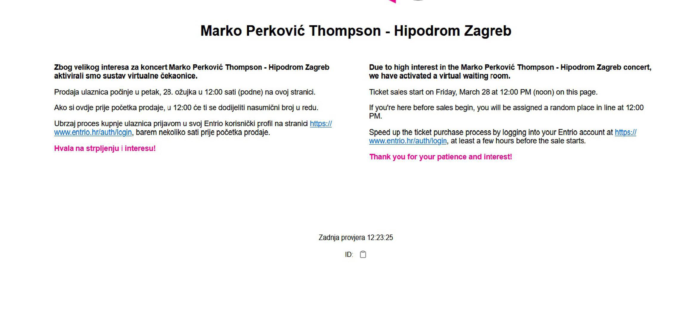 Danas točno u podne počela je prodaja ulaznica za koncert Marka Perkovića Thompsona za dugoočekivani koncert na zagrebačkom Hipodromu 5. srpnja. Zbog ogromnog interesa je Entrio aktivirao sustav virtualne čekaonice. Prije same prodaje je Entrio obavijestio one koji žele kupiti ulaznice da će im biti dodijeljen nasumični broj u redu, ako na stranici budu prije 12 sati. No, točno u podne stranica je zbog preopterećenja pala. "Laganini u čekanju na kartu, samo 19 sati čekanja. Prvo je pisalo 5 sati i onda me stranica izbacila", samo su neki od komentara na društvenim mrežama. Dakle, ako želite doći do svoje ulaznice, morate čekati u virtualnoj čekaonici, a trenutačno je tamo više od 50 tisuća ljudi.