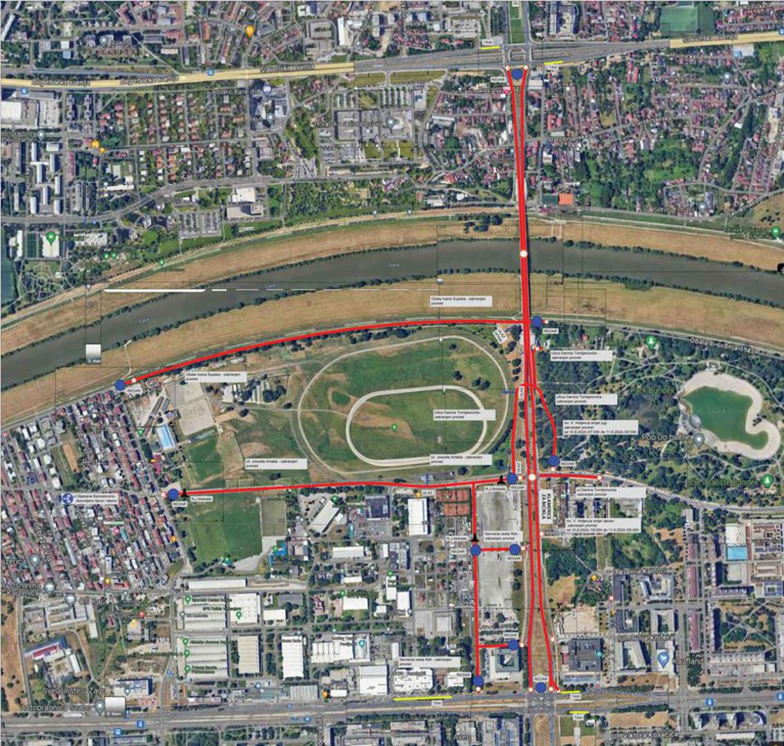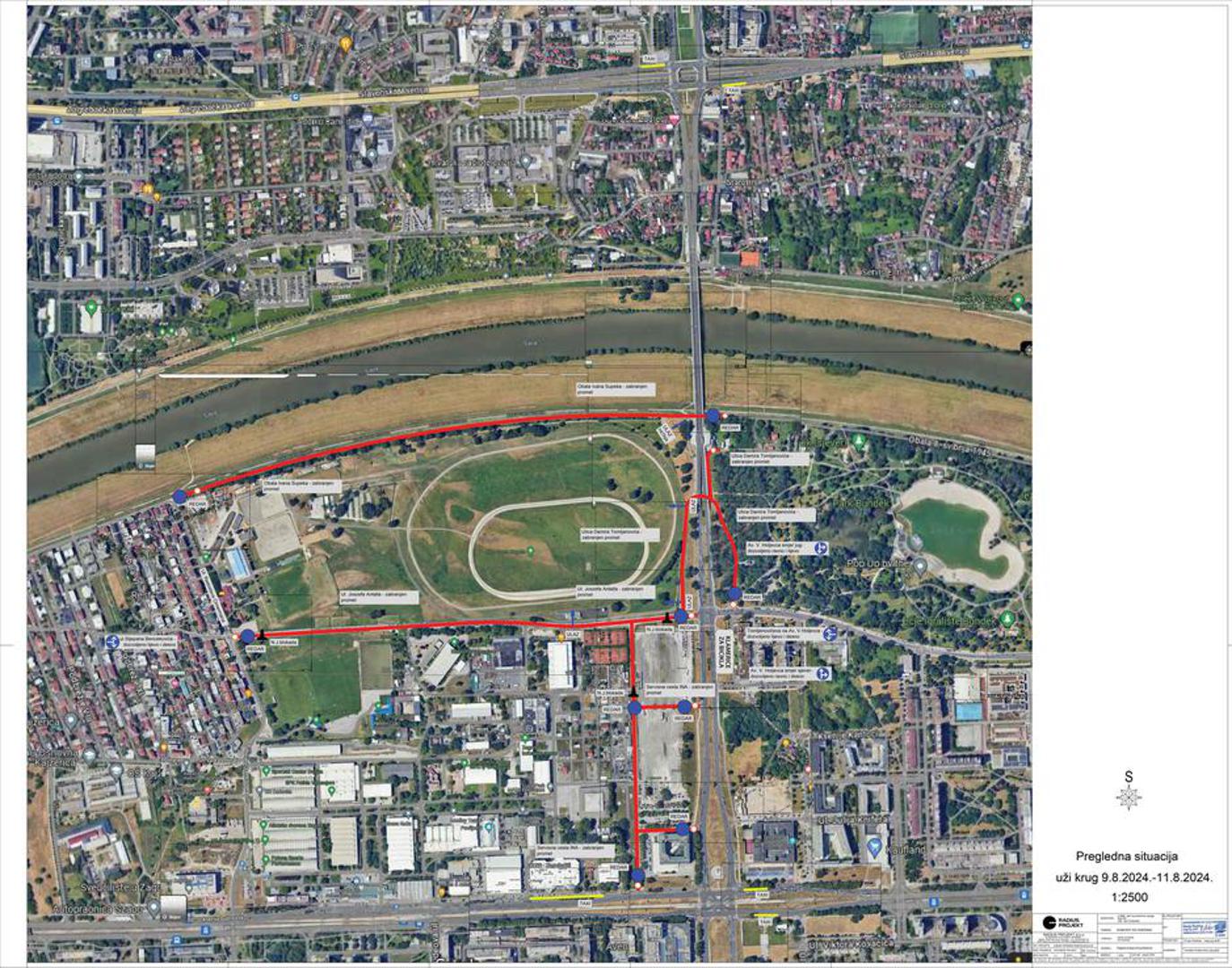 Od petka, 9. kolovoza u 19 sati do nedjelje 11. kolovoza u 5 sati bit će zatvoren uži prostor hipodroma i to Antalova od Cimermanove do Avenije Većeslava Holjevca, Obala I. Supeka od Cimermanove do Avenije Većeslava Holjevca, Servisna cesta zapadno od Inine zgrade od Antalove do Avenije Dubrovnik, dio Ulice Damira Tomljanovića Gavrana koji prolazi ispod Mosta slobode (vidi sliku ispod)