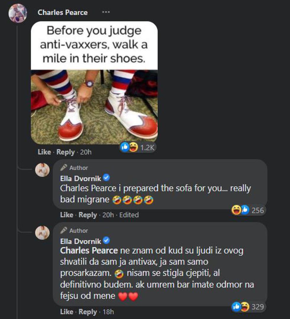 "Prije nego osudite antivaksere, prohodajte malo u njihovim cipelama" uz fotku klaunskih cipela. Brzo mu je odgovorila i Ella.