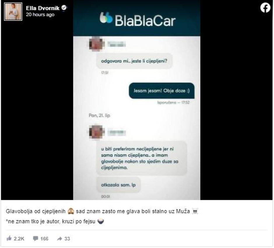 "Glavobolja od cijepljenih. Sad znam zašto me glava boli stalno uz muža", stoji uz Ellinu objavu screenshota razgovora dvije osobe na platformi BlaBlaCar, gdje je jedna osoba odbila vozača koji joj je rekao da je cijepljen.