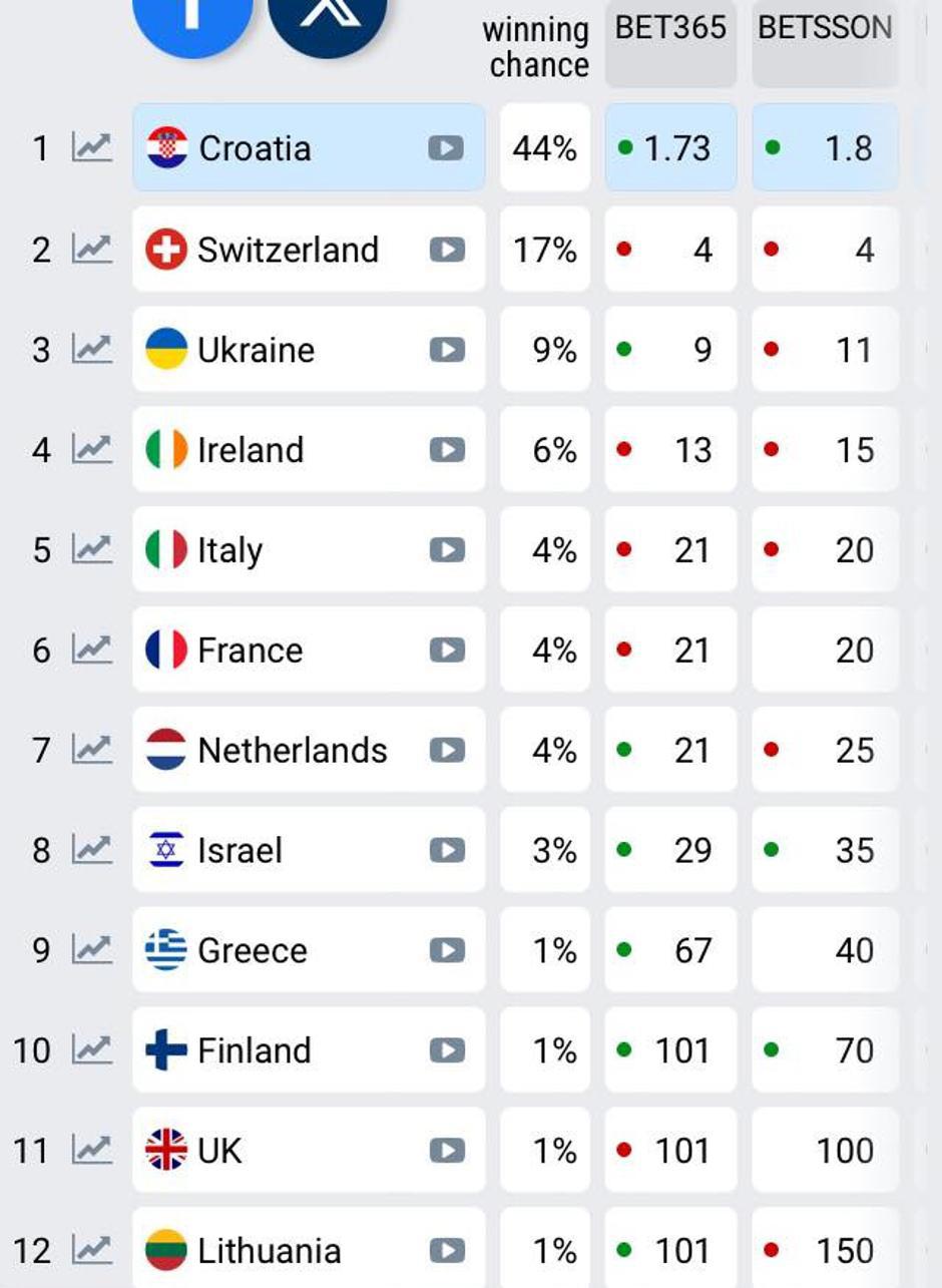 Baby Lasagna od samog početka veliki je favorit ovog Eurosonga i stalno se penje na kladionicama, a podržavaju ga ljudi iz cijelog svijeta. Isti trend se nastavio i nakon druge polufinalne večeri. Naime, hrvatskom predstavniku kladionice sad predviđaju čak 44 posto šansi za pobjedu, dok je njegov glavni konkurent, Švicarac Nemo, pao na 17 posto.