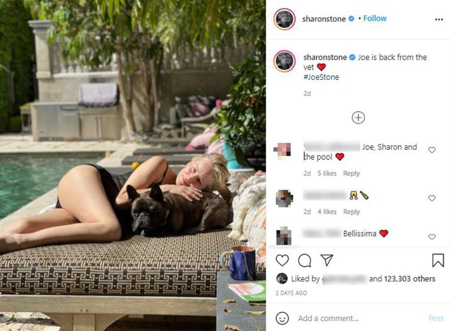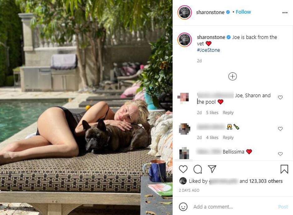 Glumica Sharon Stone (63) bila je san većine muškaraca zahvaljujući ulozi u erotskom trileru "Sirove strasti", a i danas, gotovo 30 godina kasnije, izgleda fenomenalno. na Instagramu je objavila fotografiju snimljenu na bazenu ispred njene kuće. Sharonin psić Joe vratio se od veterinara, a glumica se odmarala s njim na ležaljci. Na sebi je imala samo jednodijelni kupaći kostim.