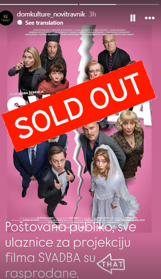 Međutim, unatoč ovom pozivu, kako je objavio Dom kulture Novi Travnik, ulaznice za film "Svadba" rasprodane su za nekoliko sati.