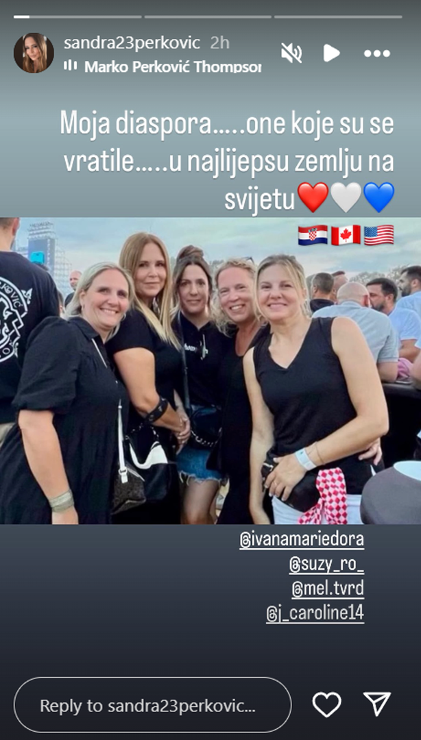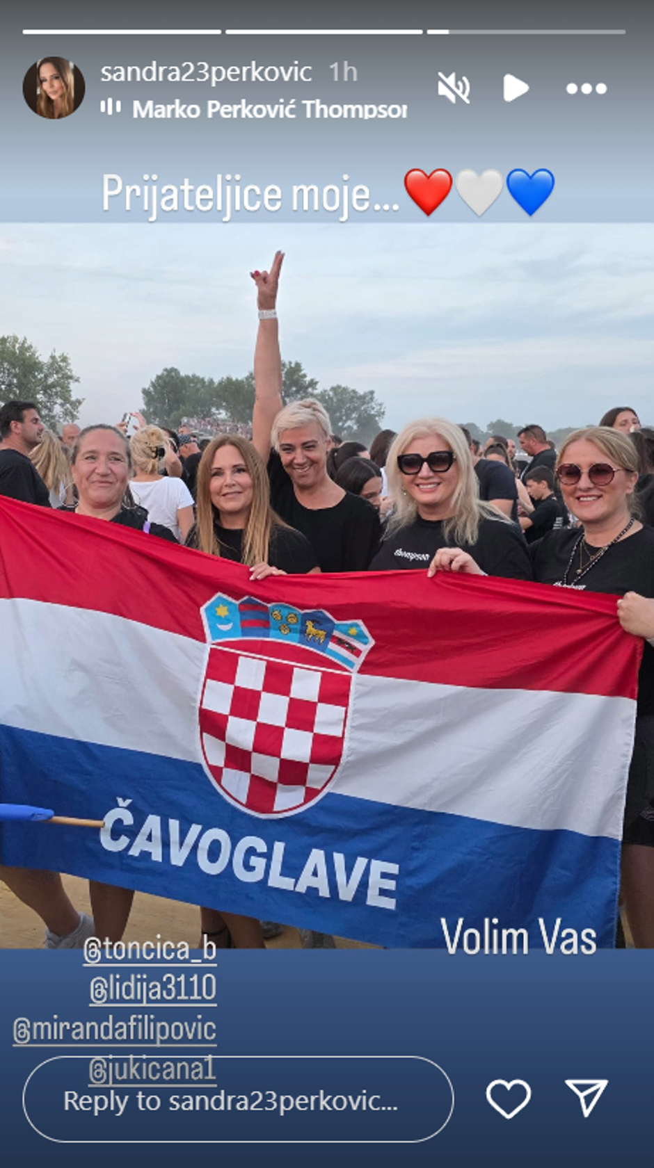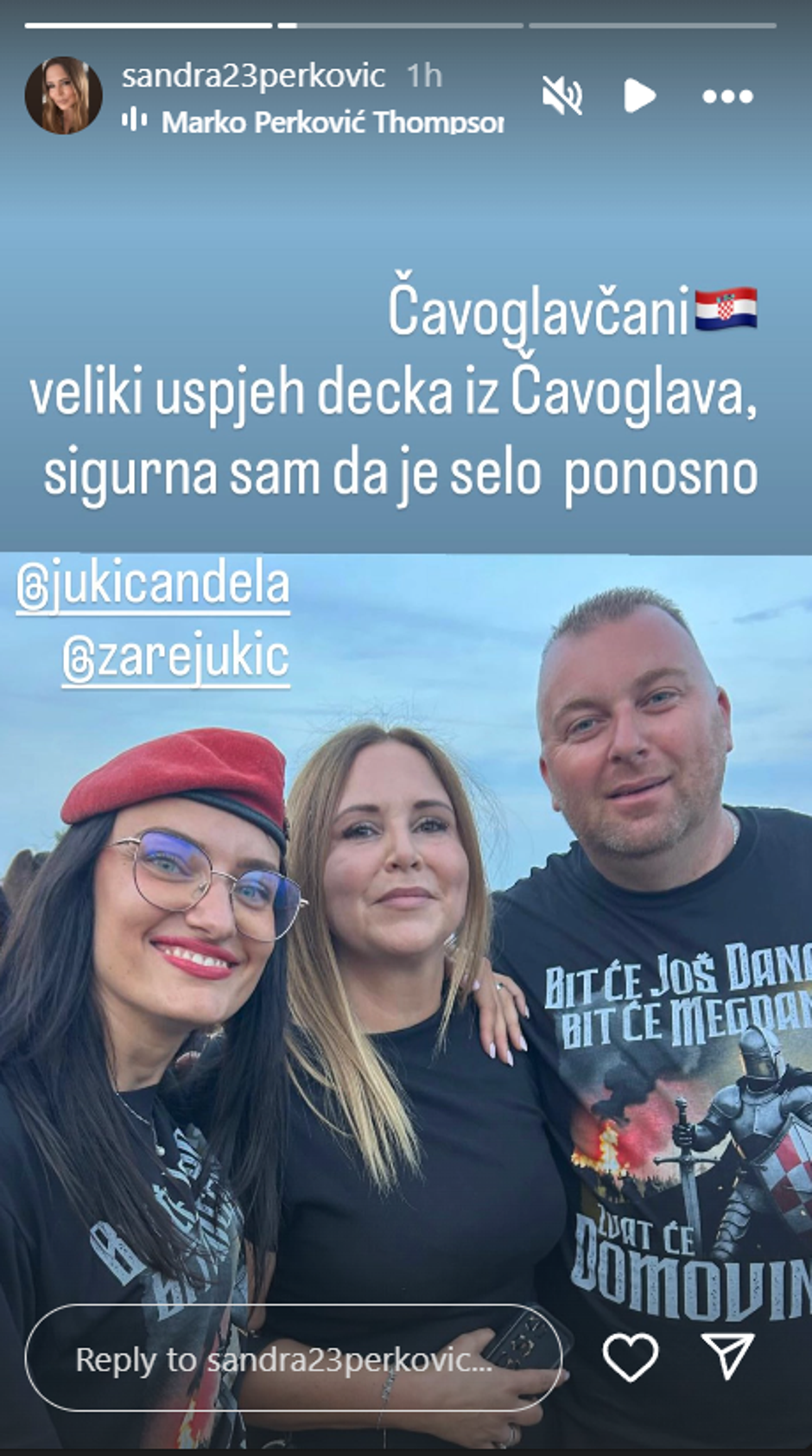 Sandra Perković, supruga poznatog pjevača Marka Perkovića Thompsona, prisustvovala je u subotu velikom koncertu svog supruga održanom na Hipodromu. Dan nakon koncerta, Sandra je na svom Instagram Storyju podijelila nekoliko fotografija s događaja. Na objavljenim slikama, Sandra se može vidjeti kako uživa na koncertu. Uz prvu fotografiju, napisala je: "Moja dijaspora... One koje su se vratile u najljepšu zemlju na svijetu". Kao zvučnu podlogu za objavu odabrala je pjesmu "Lijepa li si". Sljedeća objava prikazuje Sandru s dvoje ljudi, uz koju je dodala komentar: "Čavoglavčani. Veliki uspjeh dečka iz Čavoglava, sigurna sam da je selo ponosno". Posljednja fotografija u nizu prikazuje Sandru u društvu prijateljica.
