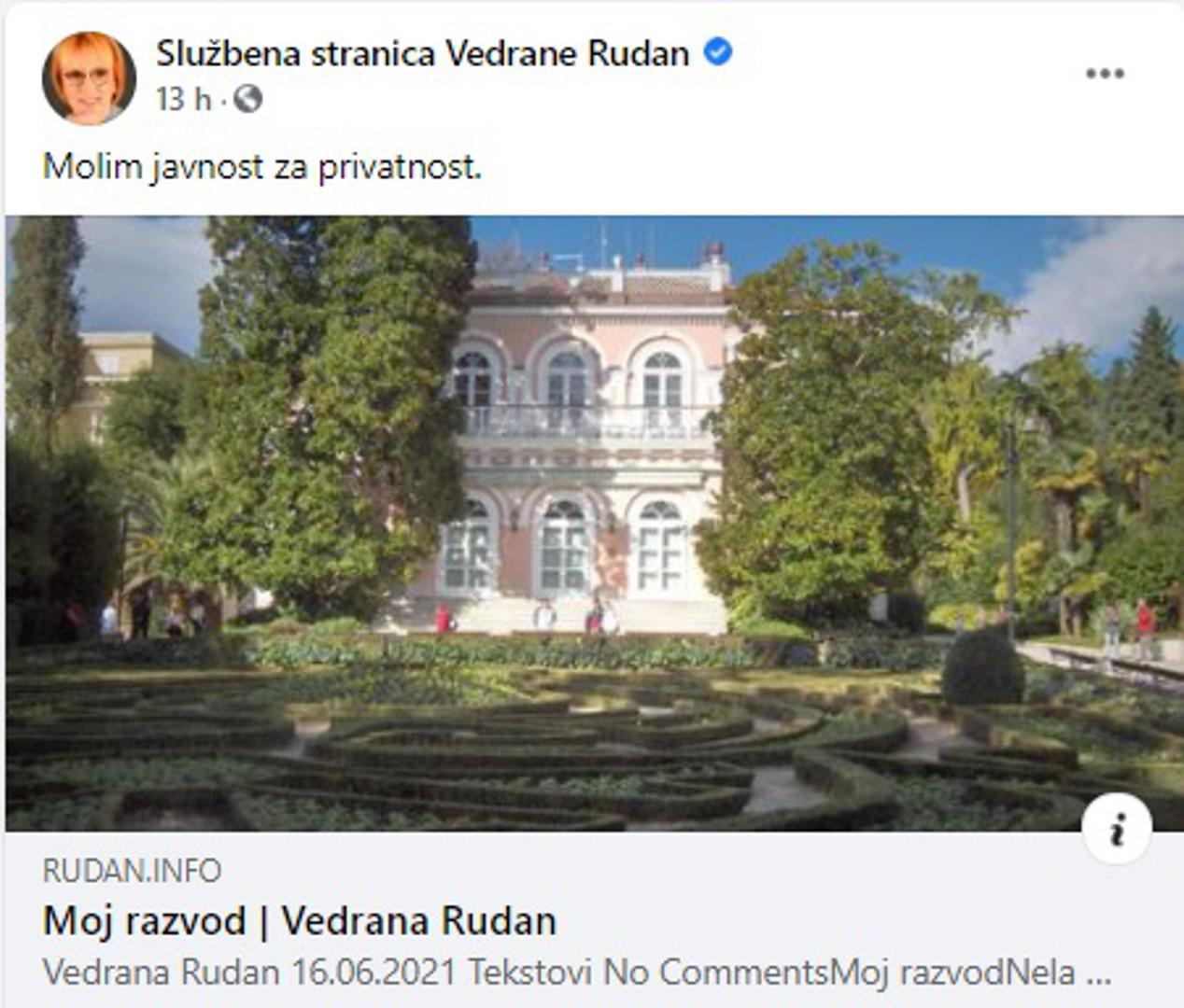 "Da sam prije ulaska u prvi znala o braku ono što znam danas kad izlazim iz trećeg, nikad se ne bih udala. Previše love i živaca ulagala sam u promašene investicije. Biti nesretan sam bolje je nego biti nesretan udvoje", napisala je na svom blogu književnica, novinarka i blogerica Vedrana Rudan (71) potvrdivši da je njezinom braku s odvjetnikom Ljubišom Drageljevićem došao kraj. U skladnom braku proveli su 30 godina pa je mnoge odluka o razlazu poprilično iznenadila. Nakon što je otkrila zbog čega se odlučila razvesti, ali i najavila skorašnje vjenčanje sa 16 godina mlađim partnerom Rudan je putem društvenih mreža zamolila za privatnost u narednom periodu.