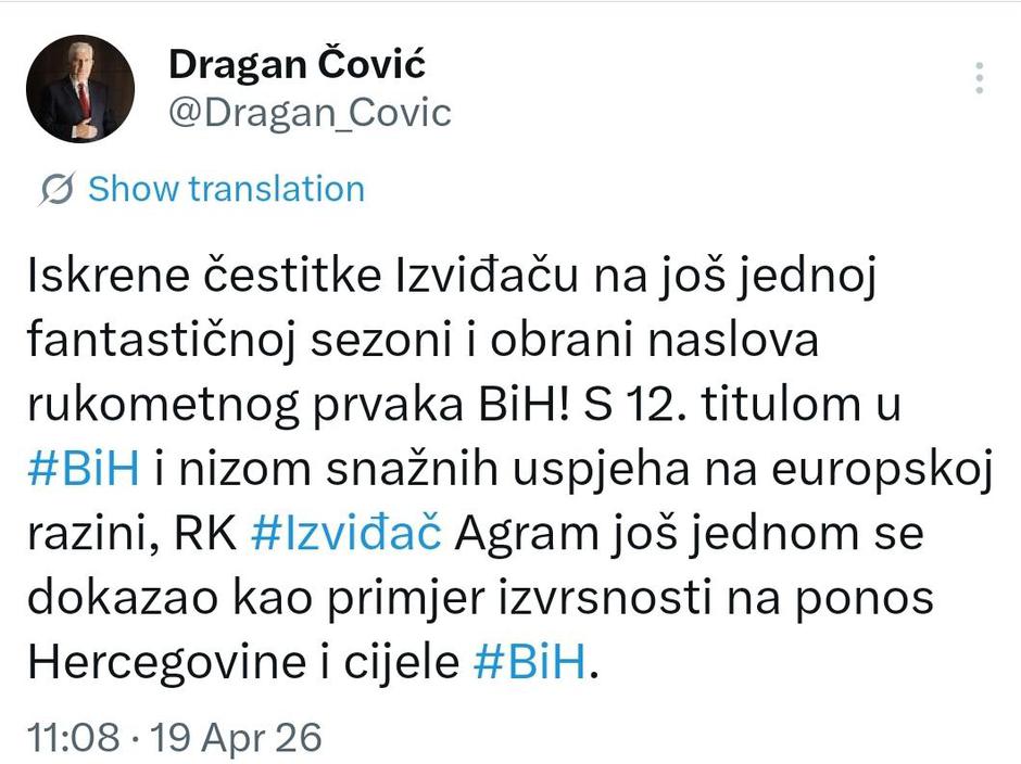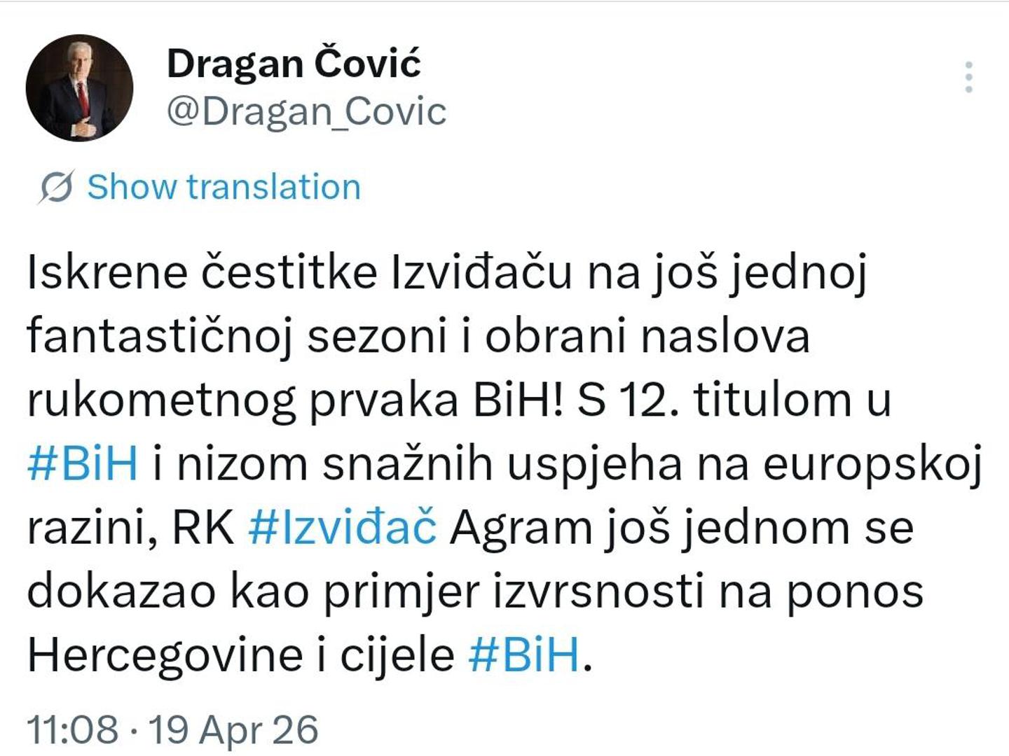 “Izviđaču iskrene čestitke na još jednoj fantastičnoj sezoni i obrani naslova rukometnog prvaka BiH. S 12. titulom u BiH i nizom snažnih uspjeha na europskoj razini, još jednom su se dokazali kao primjer izvrsnosti na ponos Hercegovine i cijele BiH”, poručio je Čović.
