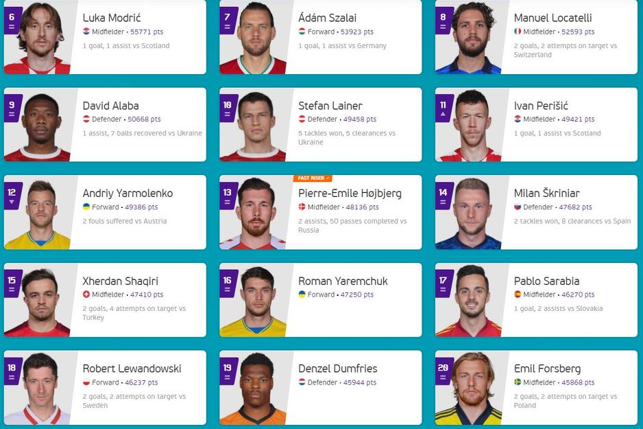 Najboljih deset zatvaraju Hrvat Luka Modrić (55.771), Mađar Adam Szalai (53.923), Italijan Manuel Locatelli (52.593), te Austrijanci David Alaba (50.668) i Stefan Lainer (49.458).