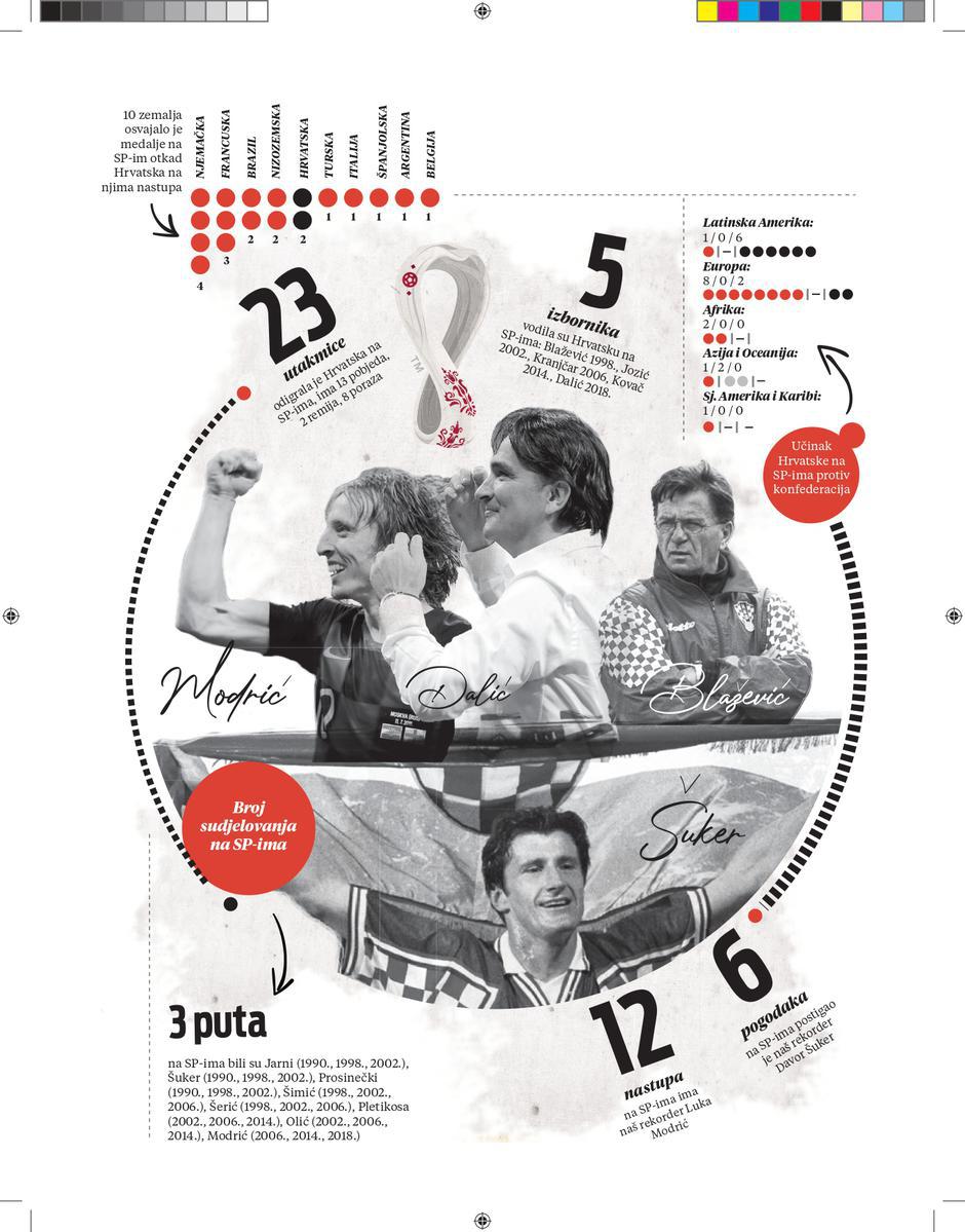 Nagradni fond Svjetskoga prvenstva u Kataru iznosi čak 450 milijuna eura (u Rusiji je bio 400 milijuna). Honorar svakoga od 32 nogometna saveza za nastup u Kataru iznosi 2,5 milijuna dolara, za nastup u grupnoj fazi zajamčeno je osam milijuna, reprezentacije koje budu eliminirane u osmini finala zaradit će dodatnih 12 milijuna dolara, a plasman u završnih osam nosi još 16 milijuna. Svjetsko prvenstvo u Kataru za hrvatsku reprezentaciju imat će posebno značenje iz nekoliko aspekata. Najprije, Hrvatska na SP prvi put dolazi kao doprvak, što je hipoteka koju treba opravdati. Na primjer, Hrvatska nikada na dva uzastopna SP-a nije bila prošla skupinu, što je tradicija koju bi bilo poželjno srušiti. Također, bit će ovo SP s teškim emotivnim utegom na leđima kapetana Luke Modrića, koji će u studenome već biti u 38. godini i sa 16-godišnjim stažem u reprezentaciji. Luka u Kataru brani svoju Zlatnu loptu iz Rusije, ali i priprema Daliću i naciji dirljivo oproštajno pismo. Neka kapetan crtu pod svoju grandioznu epopeju s vatrenima podvuče s još jednom medaljom.