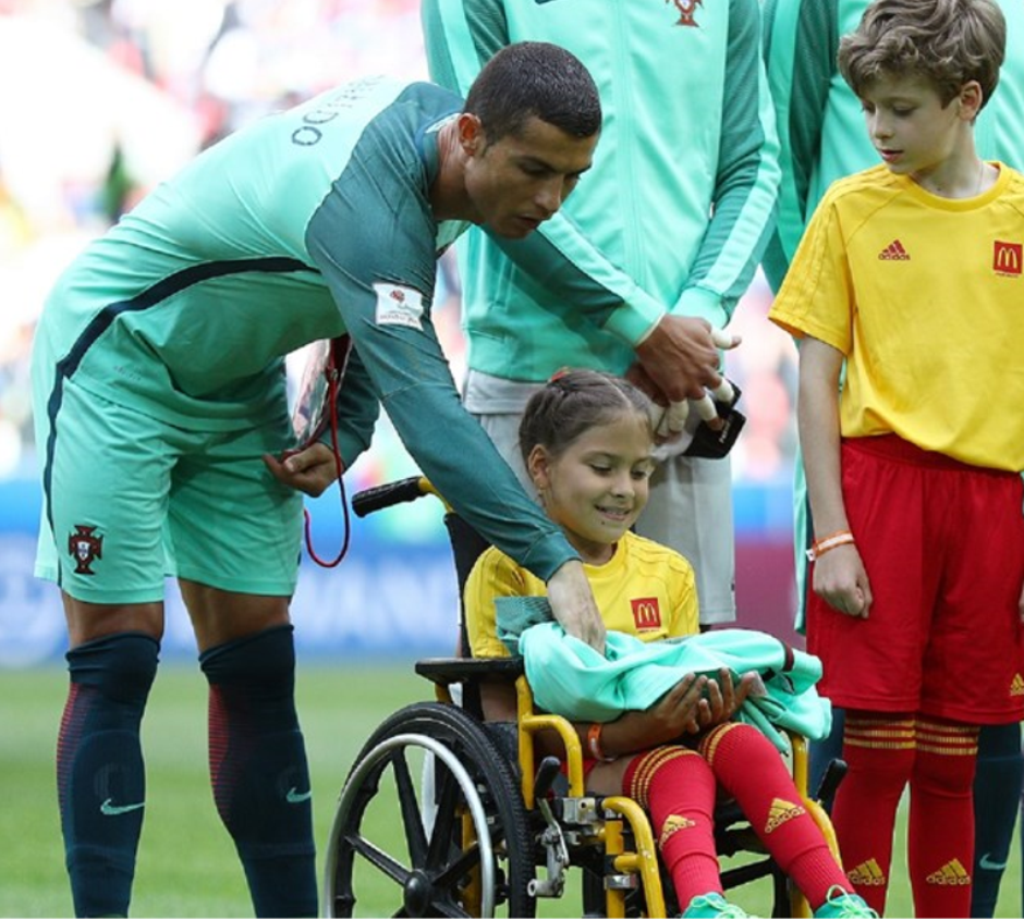 Ronaldo je uoči utakmice na travnjak izveo djevojčicu u invalidskim kolicima i postavio je ispred sebe tijekom predstavljanja momčadi. U jednom trenutku skinuo je trenirku i poklonio je djevojčici te ju je poljubio. Inače, Portugal je slavio 1:0 upravo njegovim golom.