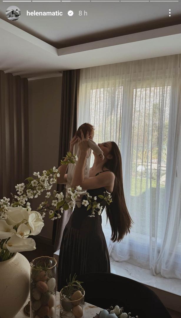 Uskrsni ponedjeljak obitelj je provela u gradu s dječakom. Tako na jednoj fotografiji Helena pozira s kolicima, dok je druga nastala na terasi restorana. Helena se za fotografiju naslonila na Dominika, koji je pak hranio sina.