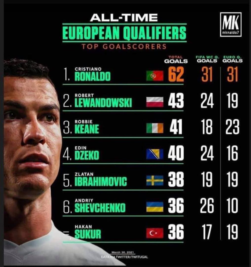 Na prvom mjestu je Cristiano Ronaldo sa 62 postignuta gola, drugi je Lewandowski sa 43, a na trećem mjestu je Robbie Keane sa 41.