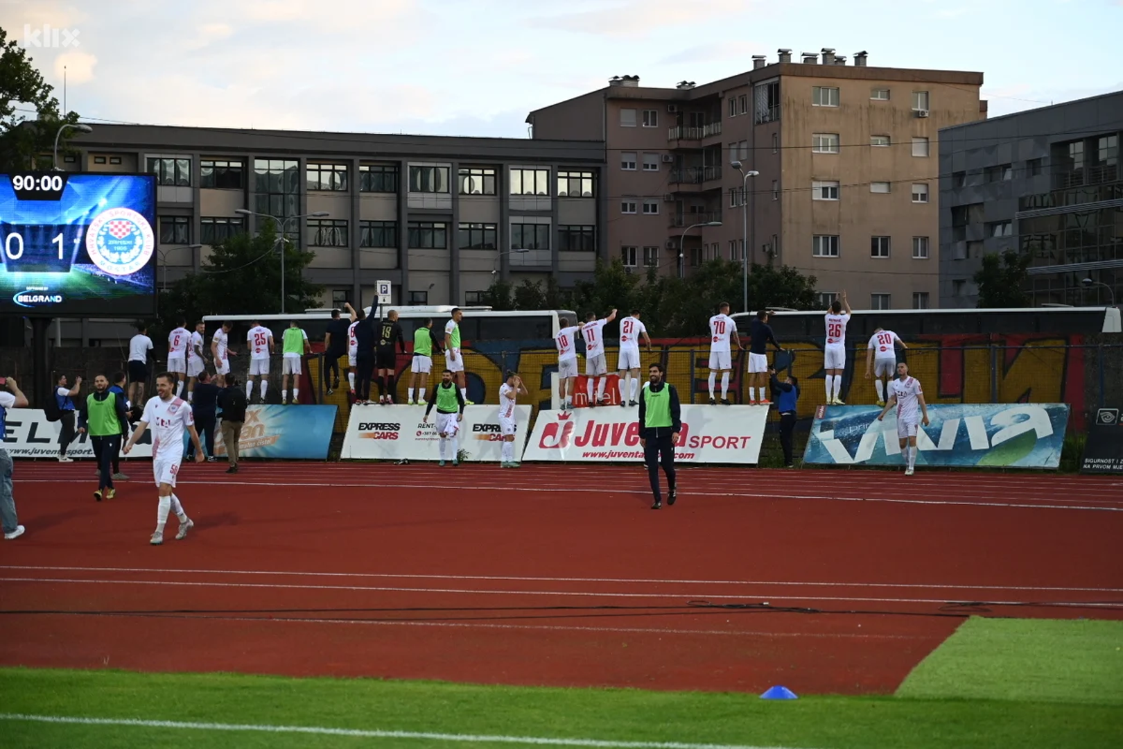Kako to praksa često nalaže, gostujući navijači ispraćeni su sa stadiona prije posljednjeg sudskog zvižduka, a sve zbog sigurnosnih razloga. Dok su gostujući navijači bili u autobusima, Peljto je označio kraj utakmice, a nogometaši Zrinjskog su otrčali do autobusa kako bi slavili sa svojim navijačima, piše Klix.ba.