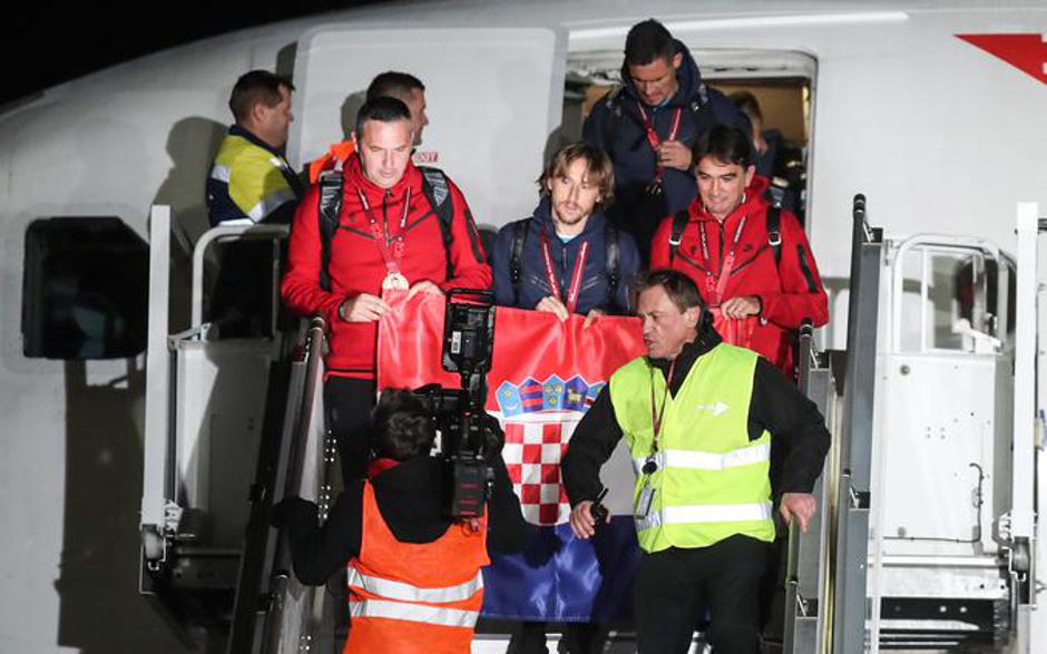 Luka Modrić, Marijan Kustić i izbornik Zlatko Dalić prvi su izašli iz aviona noseći hrvatsku zastavu. Trenutak su svi putnici ovjekovječili zajedničkom fotografijom.