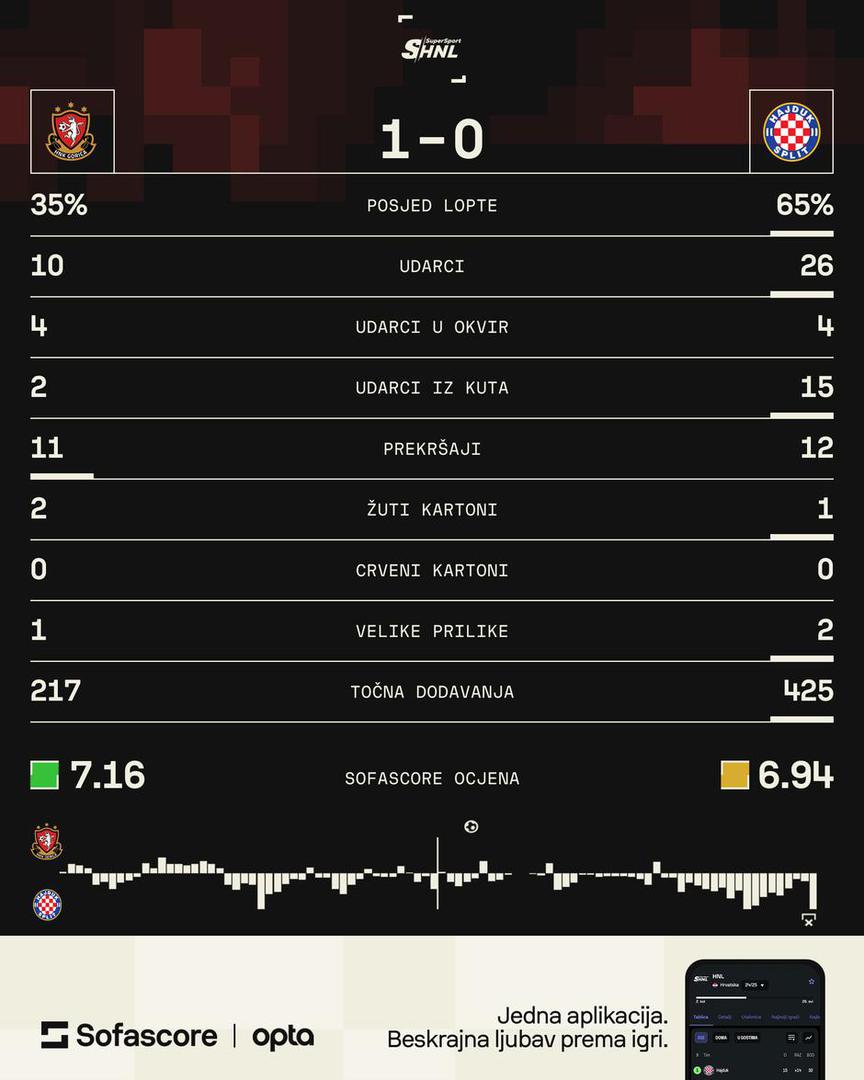 U 32. minuti je blokiran pokušaj Melnjaka, dok su novi nalet Splićani imali na samom kraju prvog dijela. Prvo je zaprijetio Biuk, a potom je pored vrata pucao Šarlija.