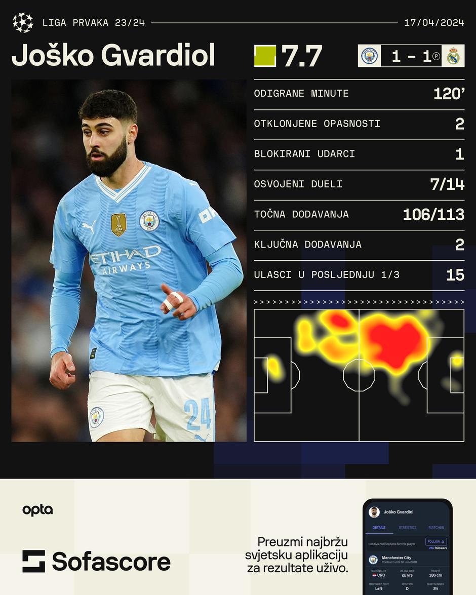 Joško Gvardiol odigrao je izvrsno. Blokirao je jedan doista opasan udarac koji je mogao urušiti njegovu momčad i sjekao dodavanja u ključnim trenucima, otklonio dvije velike opasnosti koje je Real stvorio. Dobio je 50 posto duela, to jest njih sedam od 14 u kojima se našao. U fazi napada probijao je redove Reala preciznim dodavanjima prema Jacku Grealishu koji je tijekom cijelog nastupa vodio pravi rat s Danielom Carvajalom. Od 113 pokušaja dodavanja imao je 106 točnih, a od toga su 2 bila ključna. Gvardiol se nakon gorkog poraza oglasio na društvenim mrežama.
