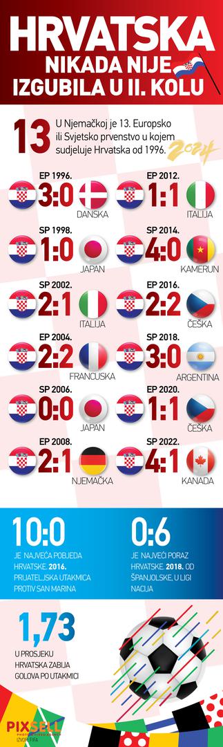 Od 1996. godine Hrvatska je sudjelovala na 13. Europskih i Svjetskih nogometnih prvenstava te nije izgubila niti jednu utakmicu u drugom kolu. U prosjeku Hrvatska je zabila po utakmici 1,73 gol.