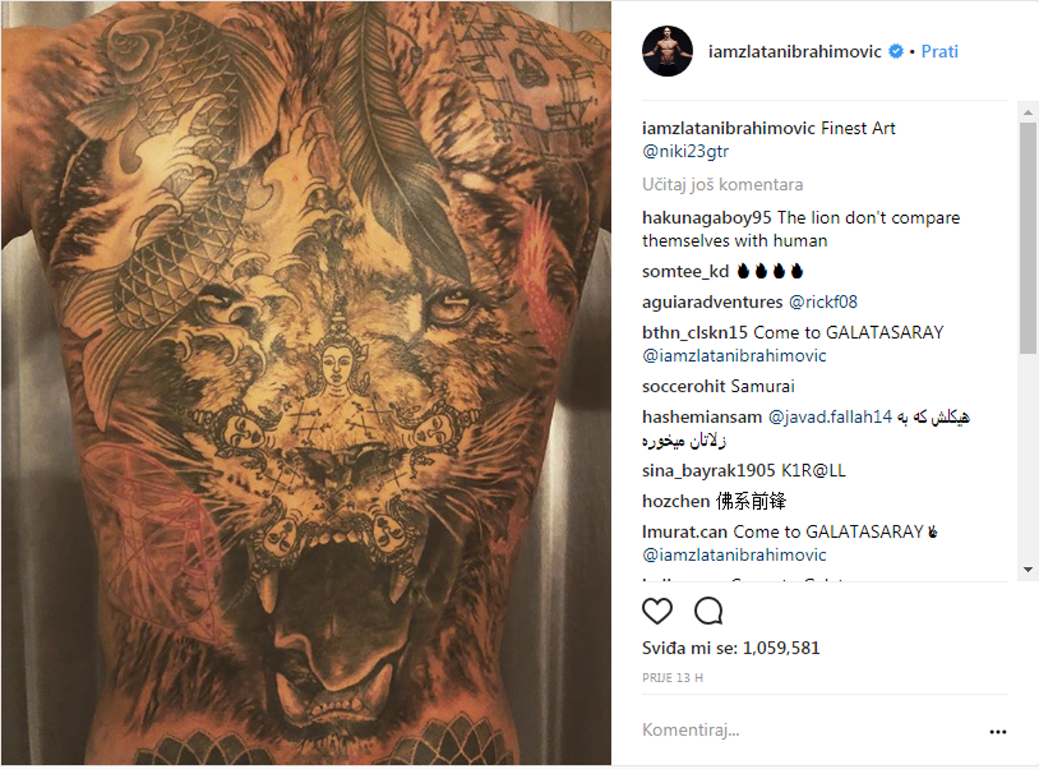 Tetovaža je djelo majstora iz Göteborga, a Zlatanovi obožavatelji u komentarima nisu skrivali koliko su oduševljeni.