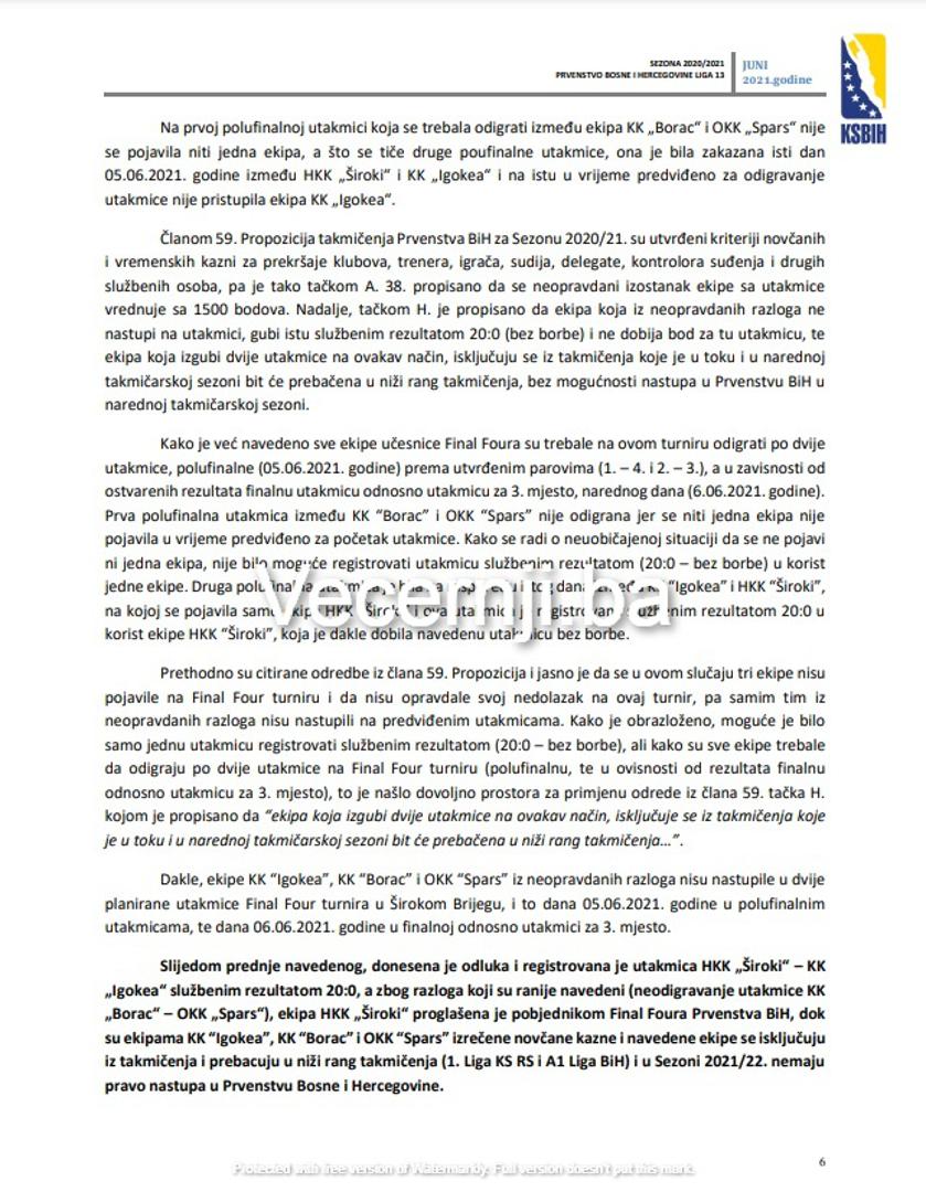 Ubrzo je Igokea otkazala domaćinstvo Final Foura i Košarkaški savez BiH ga je dodijelio Širokom, ujedno i jedinom od šest timova iz Lige za prvaka koji je želio igrati završnicu, a kako se spomenuti klubovi nisu pojavili na završnici Prvenstva BiH, KS BiH donio je strogu odluku i izbacio klubove iz prve lige.