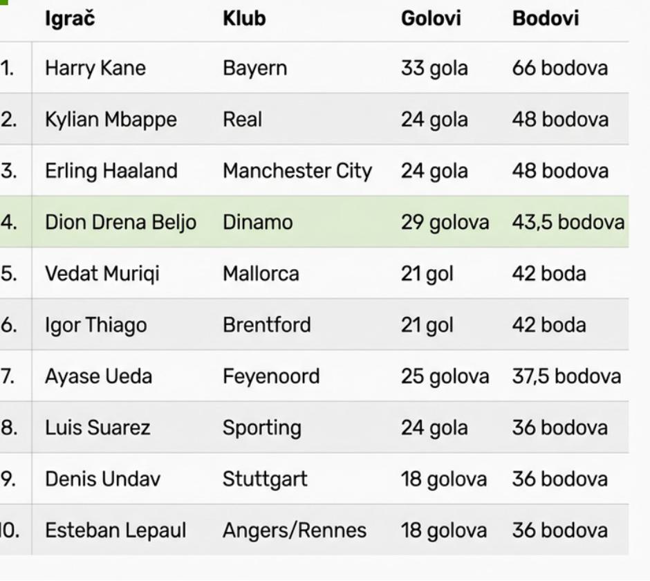 Beljo je tako, unatoč 29 golova, na 43,5 bodova. Harry Kane, koji je za Bayern zabio 33 gola, ima 66 bodova jer se Bundesligin koeficijent množi s dva. Ispred Belje su i Kylian Mbappé te Erling Haaland, koji imaju manje golova od njega, ali im svaki pogodak zbog jačine lige vrijedi više. Obojica su na 48 bodova.
