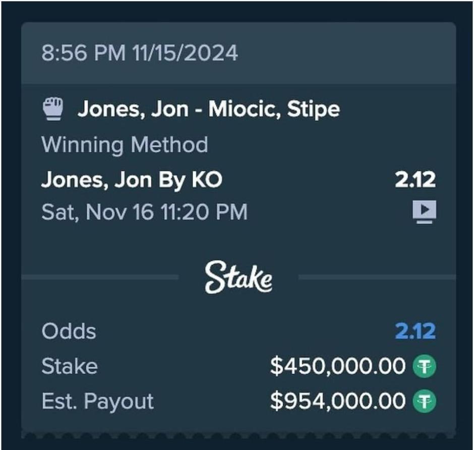 – Bit će to borba kakvu nikad dosad nismo vidjeli. Jonesova pokretljivost i dužina ekstremiteta mogu biti prednost, no ne smijete podcijeniti Stipinu snagu i borbu u parteru. A najpoznatiji svjetski reper Drake uvjeren je u pobjedu Jona Jonesa, no nije se pokazao kao vrsni znalac kladionice. Prvo se kladio na Tysona protiv Paula i fulao, pa po tome mozda promaši i Jonesa. Drake je na slavlje uložio 450 tisuća dolara, a ukoliko Jones slavi, kladionica će mu isplatiti gotovo milijun dolara, što je i objavio na svom Instagramu.