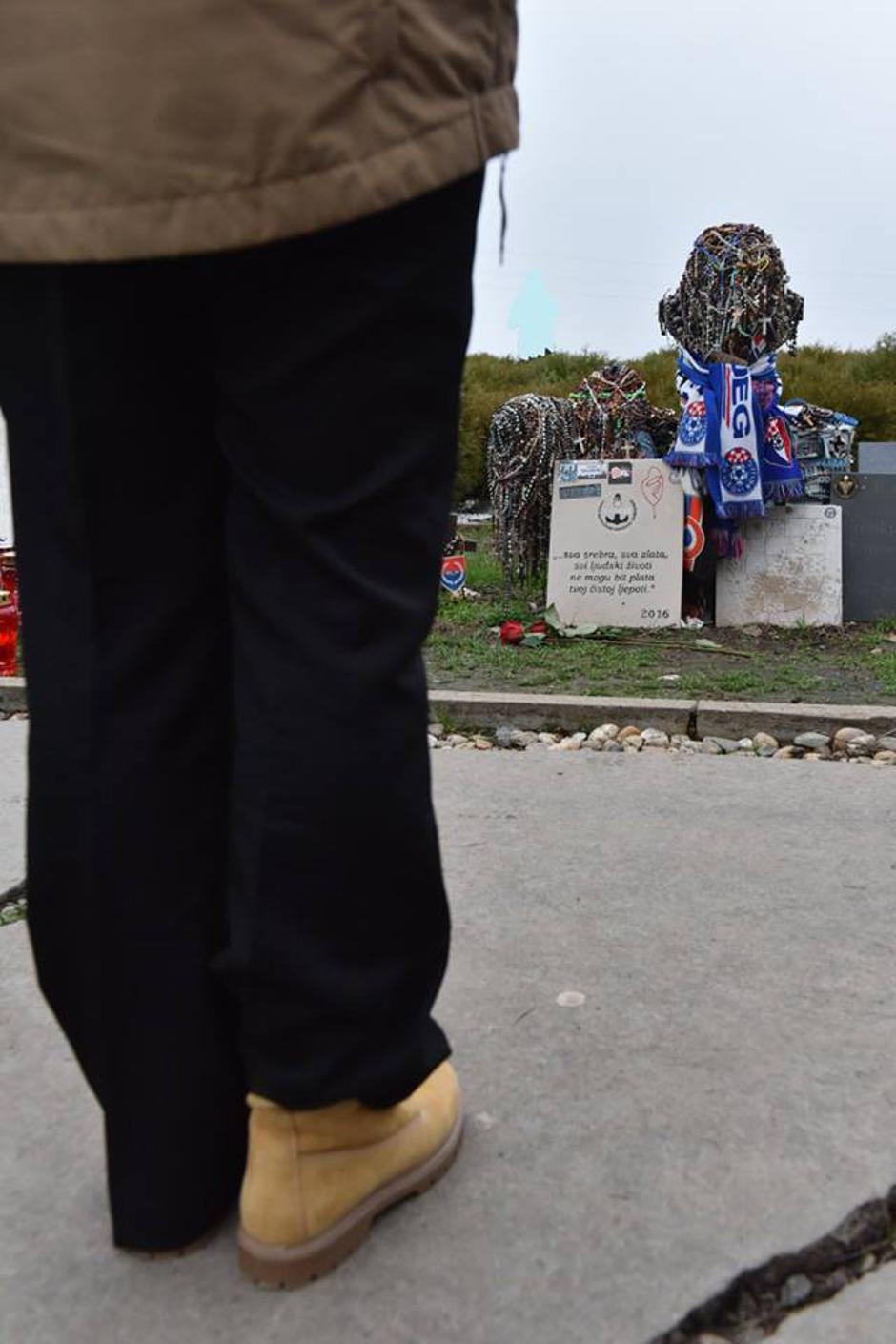 Na fotografiji se vidi prepoznatljivi križ s velikim brojem krunica na vukovarskoj Ovčari, a oko njega je zamotan navijački šal NK Široki Brijeg.