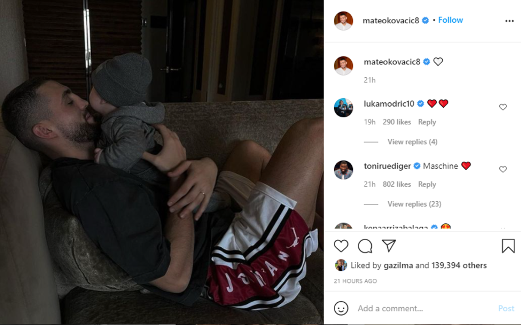 Hrvatski nogometni reprezentativac i igrač Chelsea Mateo Kovačić (26) na Instagramu je "rastopio" niz pratitelja objavivši fotografiju sa sinom kojeg je dobio sa suprugom Izabel u listopadu prošle godine.