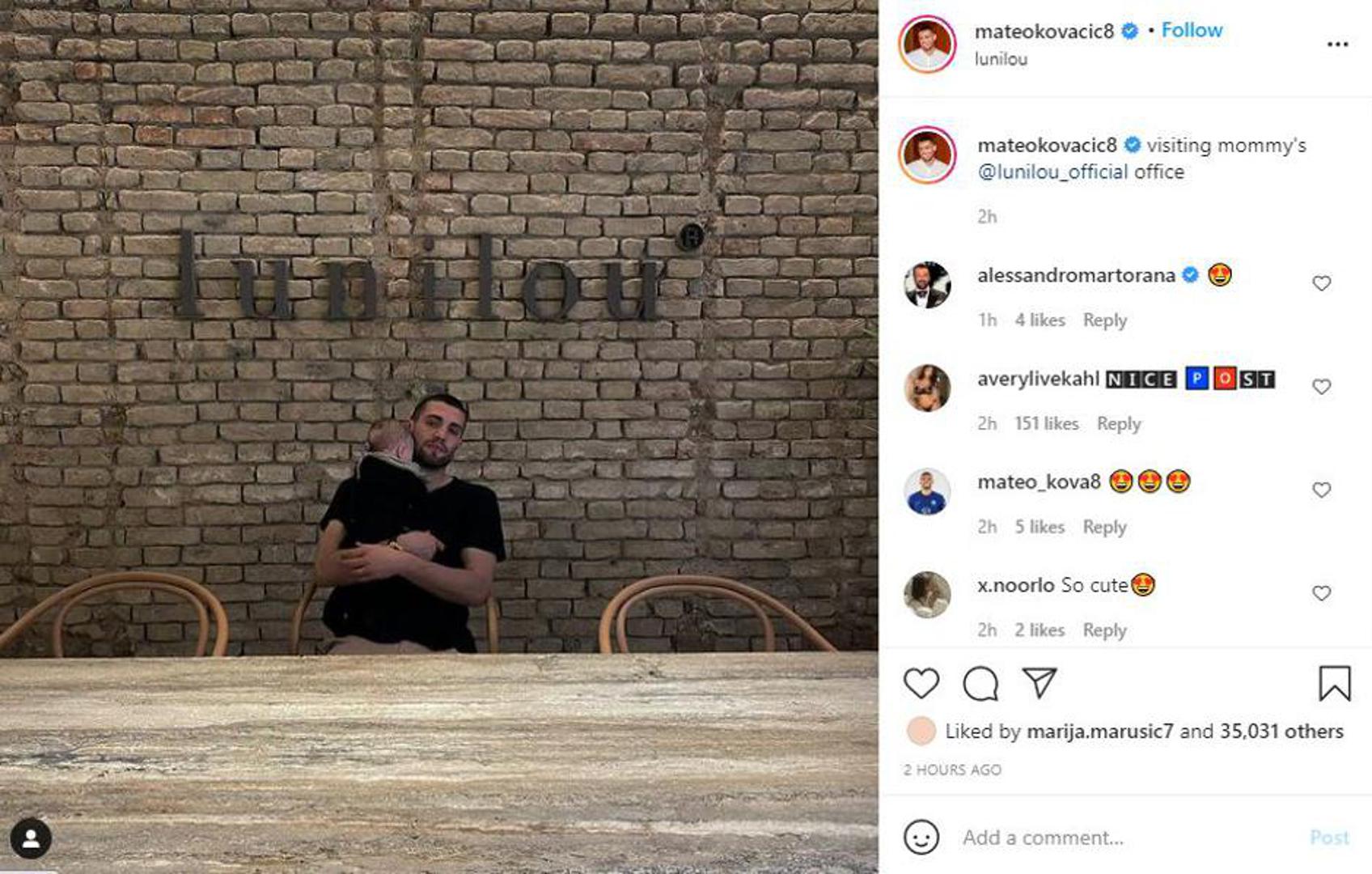 Hrvatski nogometni reprezentativac Mateo Kovačić raznježio je pratitelje novom fotografijom. Posjetio je svoju suprugu Izabel Kovačić u svom uredu brenda Lunilou iza kojeg stoji već godinama sa sestrom Ivanom.