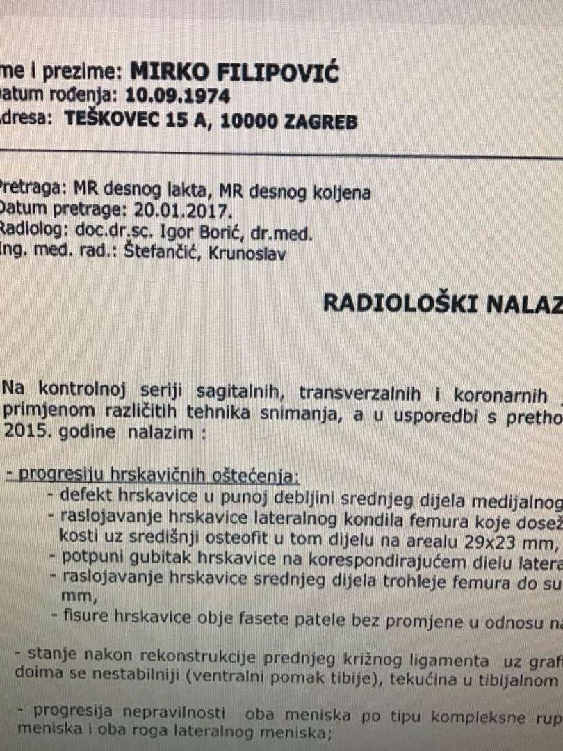 Hrvatski majstor borilačkih vještina Mirko Filipović podijelio je s javnosti dio radiološkog nalaza magnetske rezonancije desnog koljena koji je potvrdio njegove riječi nakon osvajanja Rizinova Grand Prixa kako je "tu sve potrgano".