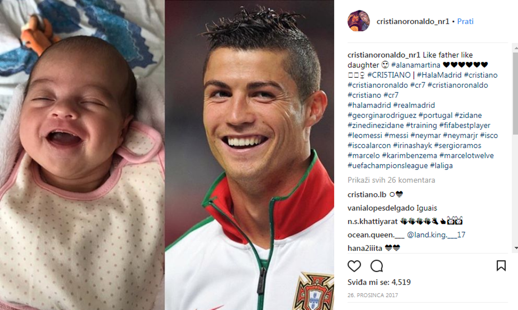 Prošlog prosinca Ronaldova djevojka Georgina Rodriguez objavila je sliku na kojoj se itekako vidi sličnost zvijezde Reala i njegove kćerke Alana Martine.