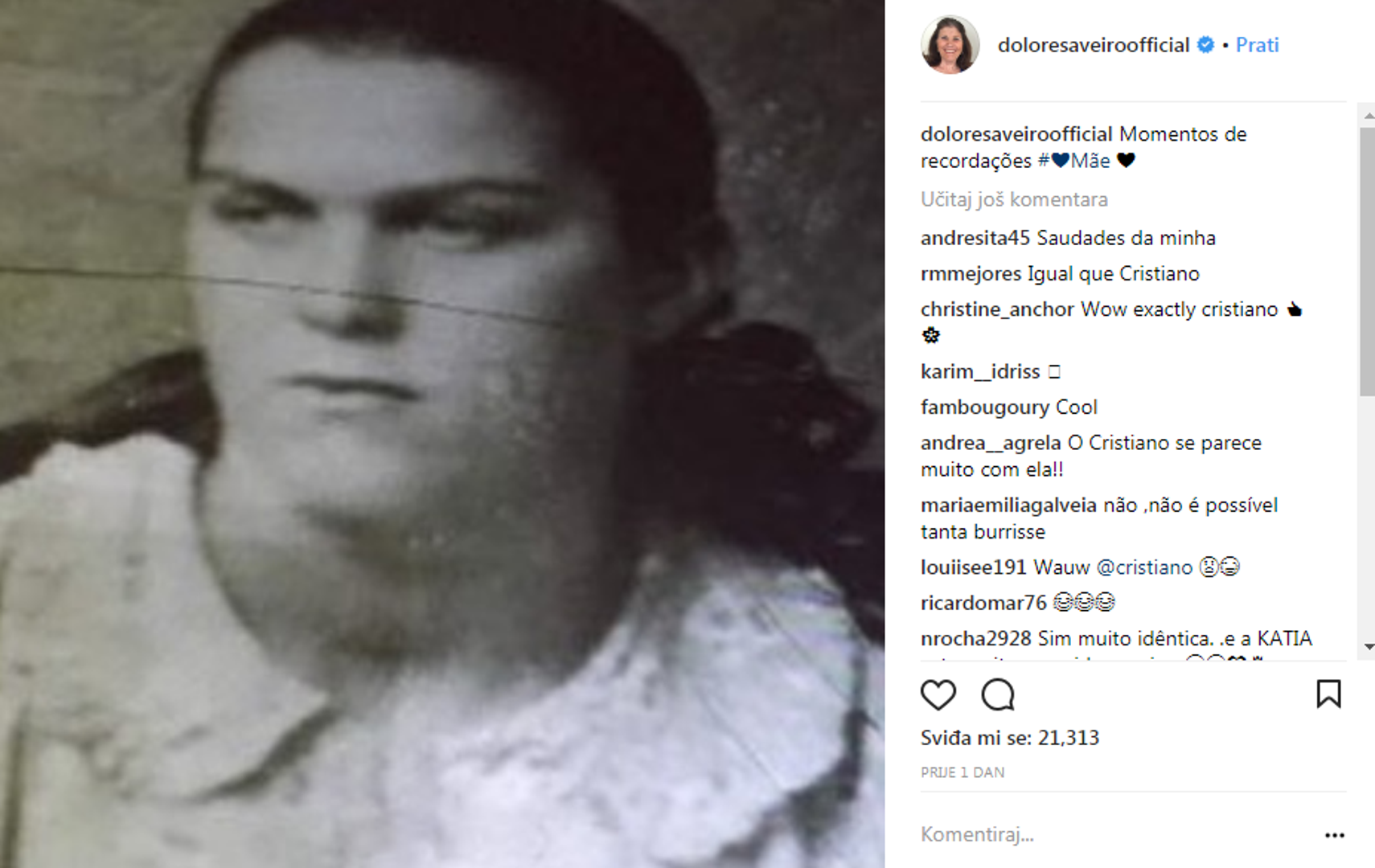 - Sjećanje na majku - napisala je Dolores Aveiro ispod crno-bijele fotografije, a ubrzo su stigli prvi komentari.