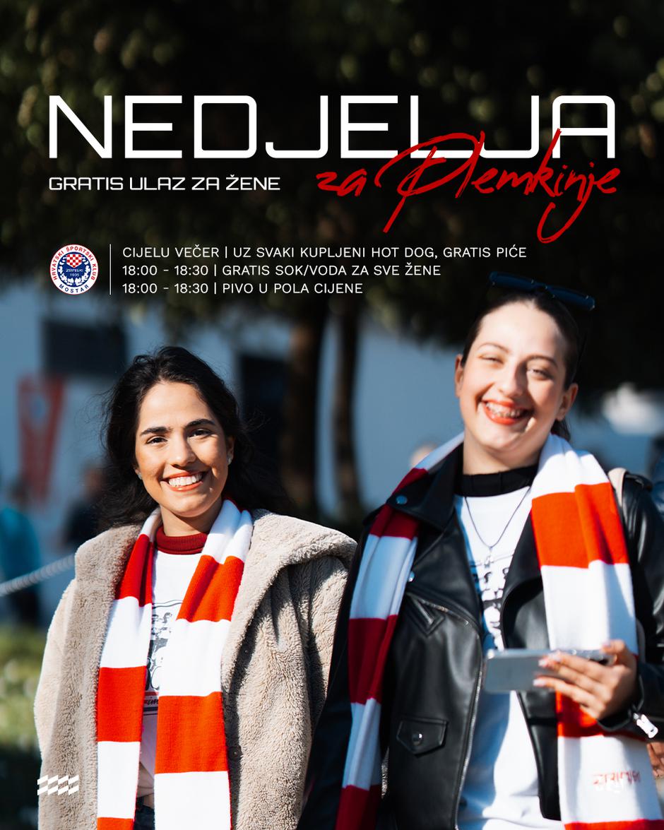 NEDJELJA ZA PLEMKINJE: U povodu Međunarodnog dana žena, 8. ožujka, u nedjelju smo osigurali gratis ulaz za sve naše Plemkinje te besplatno osvježenje u vidu soka/vode do 18.30 na našim službenim prodajnim mjestima na sjevernom i južnom ulazu! Susret protiv FK Radnik na rasporedu je od 19 sati, a i ovaj put se za sve isplati doći ranije. Dođi ranije i podrži HŠK Zrinjski u borbi za nove bodove! - naveli su na društvenim mrežama iz aktualnog nogometnog bh. prvaka uz prigodni emotikon te tako još jednom pokazali da su im svi navijači i gledatelji podjednako važni.
