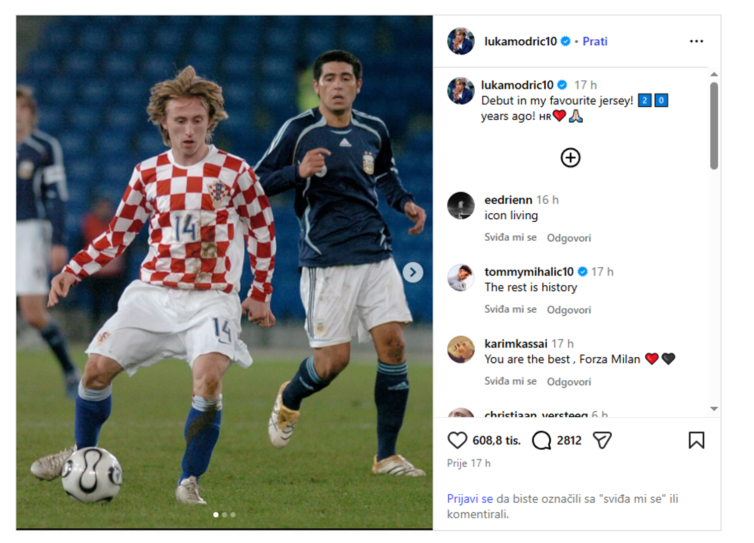Hrvatska nogometna legenda Luka Modrić nije osoba koja često dijeli uspomene na društvenim mrežama. Upravo zato, kada se kapetan Vatrenih javi, njegove objave masovno se dijele i komentiraju jer znamo da se radi o nečem posebnom. Hrvatska je prije dvadeset godina, 1. ožujka 2006., na stadionu St. Jakob Park u Baselu igrala prijateljski susret protiv Argentine koji je ušao u povijest.