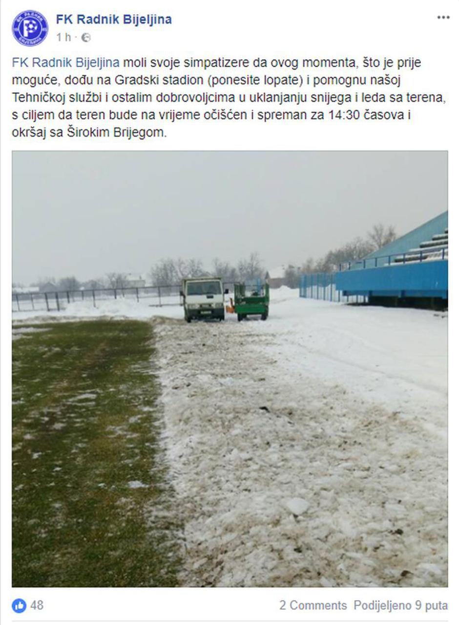 Na službenoj Facebook stranici kluba jutros je objavljena fotografija uz apel svim simpatizerima kluba da što je prije moguće dođu s lopatama na Gradski stadion kako bi se teren osposobio do 14.30 sati za kada je planirano odigravanje susreta.