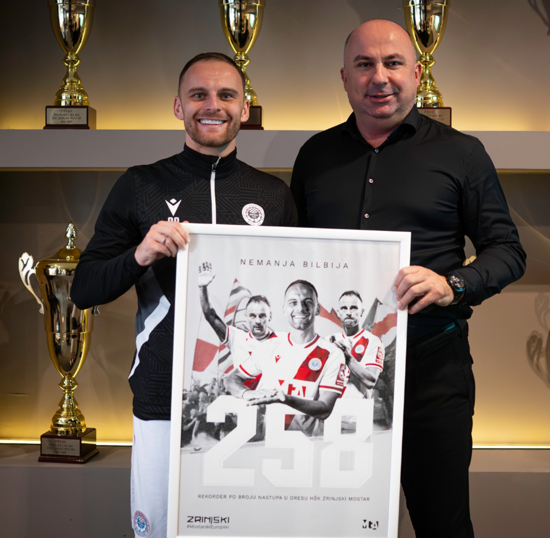 Kapetan Nemanja Bilbija rekorder je po broju nastupa u dresu HŠK Zrinjski iz Mostara. Predsjednik Uprave kluba Denis Lasić uručio mu je prigodan dar u povodu 258. nastupa za Plemiće u 10. kolu Wwin lige BiH protiv Igmana. - Povijesne brojke na kojima nećemo stati - objavili su iz Zrinjskog na društvenim mrežama uz fotografiju Lasića i Bilbije.