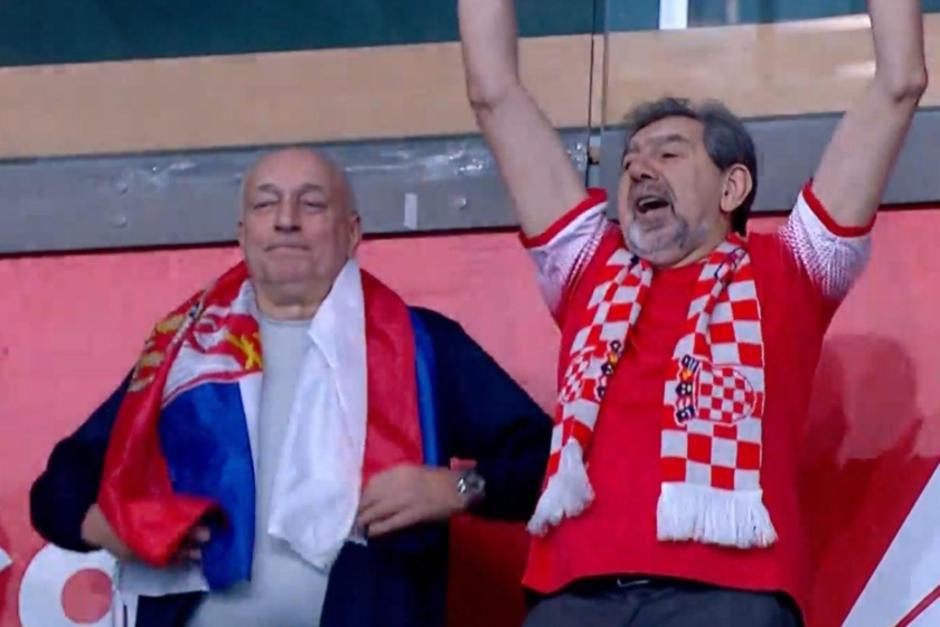 Zanimljiva scena na tribinama beogradske arene viđena je krajem prve četvrtine utakmice između Hrvatske i Italije koja je završila 3:3. Televizijska kamera uhvatila je dvojicu navijača, od kojih je jedan bio zagrnut srpskom zastavom, a drugi hrvatskim šalom, i veselio se golu hrvatske reprezentacije.