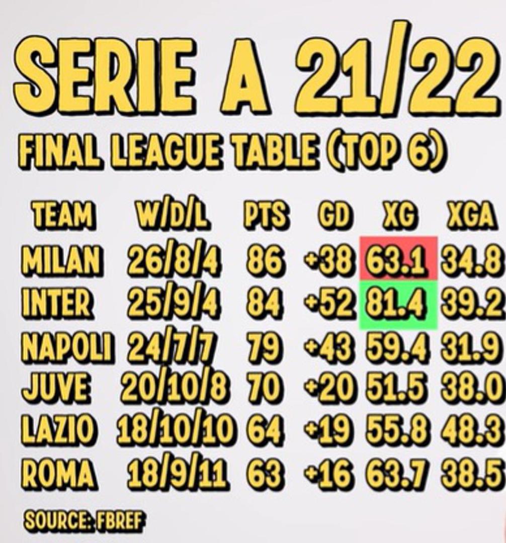 Kad pogledate Milanov stil igre i proučite neke njihove statističke parametre, shvatite da oni koji Milanu nisu davali šansu za naslov čak i nisu bili pretjerano u krivu. Po očekivanim postignutim golovima Milan (63,1 u sezoni) je bio tek četvrta momčad lige, s 20 očekivanih pogodaka manje negoli njihov gradski rival Inter. Bili su nešto bolji po očekivanim primljenim golovima (34,8 u sezoni), ali ni tu nisu bili na vrhu ligaške ljestvice jer je ispred njih bio Napoli.