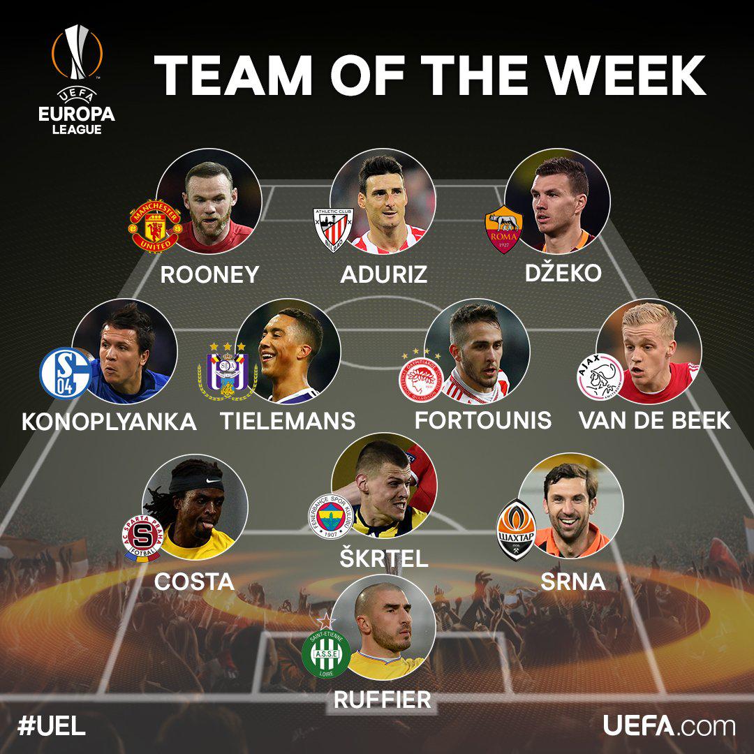 Uefina momčad kola: Stéphane Ruffier (Saint-Étienne) - Darijo Srna (Šahtar), Martin Škrtel (Fenerbahče) Costa Nhamoinesu (Sparta Prag) - Donny van de Beek (Ajax), Kostas Fortounis (Olympiacos), Youri Tielemans (Anderlecht), Jevhen Konopljanka (Schalke) - Edin Džeko (Roma), Aritz Aduriz (Athletic), Wayne Rooney (Manchester United).