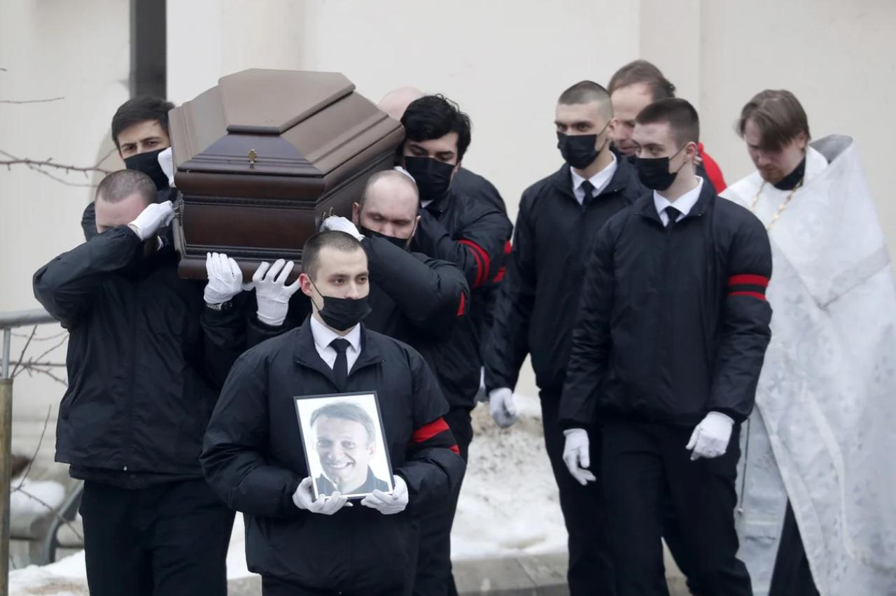 Pristalice ruskog oporbenog lidera Alekseja Navalnog formirale su duge redove u blizini crkve u Moskvi prije njegove sahrane kad su uzvikivali njegovo ime dok su njegov kovčeg iznosili iz pogrebnih kola po dolasku u crkvu ikone Bogorodice.