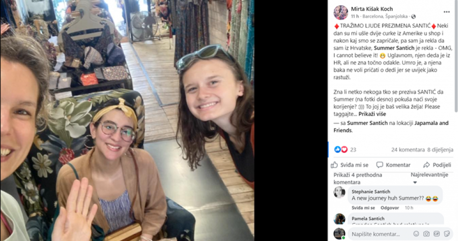 Na društvenim mrežama se Hrvatskom nedavno proširila neobična objava Mirte Kišak Koch koja Amerikanki Summer Santich pomaže pronaći hrvatske korijene.