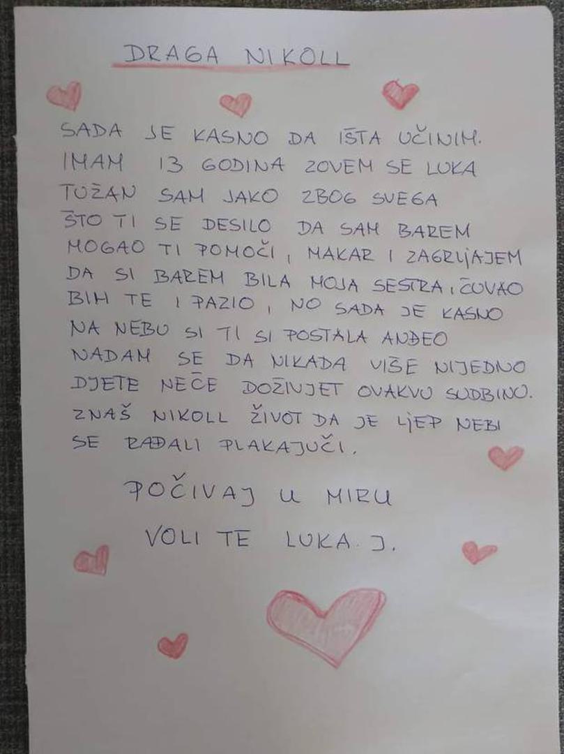 - Da si barem bila moja sestra, čuvao bih te i pazio, no sada je kasno. Na nebu si, ti si postala anđeo. Nadam se da nikada više ni jedno dijete neće doživjeti ovakvu sudbinu - dio je nježnog pisma koje je mali Luka posvetio Nikoll.