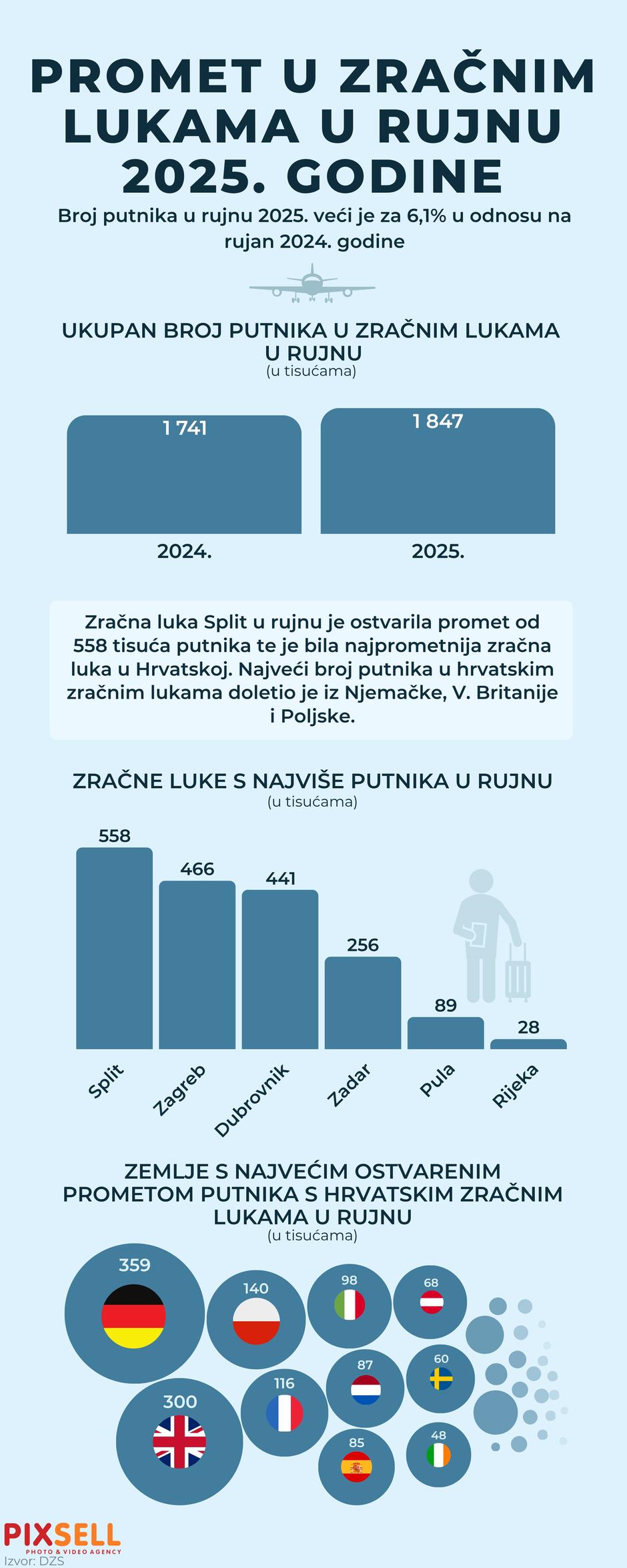 U rujnu 2025. godine hrvatske zračne luke zabilježile su ukupno 1,847 milijuna putnika, što je porast od 6,1% u odnosu na rujan 2024., kada ih je bilo 1,741 milijun. Najprometnija je bila Zračna luka Split s 558 tisuća putnika, slijede Zagreb (466 tisuća), Dubrovnik (441 tisuća), Zadar (256 tisuća), Pula (89 tisuća) i Rijeka (28 tisuća). Najviše putnika u hrvatske zračne luke stiglo je iz Njemačke (359 tisuća), Ujedinjenog Kraljevstva (300 tisuća) i Poljske (140 tisuća), a slijede Francuska, Italija, Nizozemska, Španjolska, Austrija, Švedska i Irska.