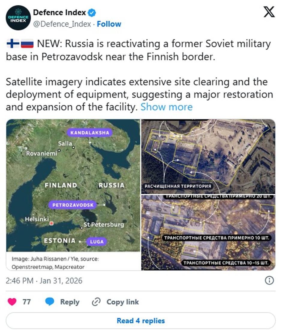 Rusija obnavlja napuštenu vojnu bazu u Petrozavodsku, koja graniči s Finskom, kako bi smjestila do 15.000 vojnika u sklopu novoformiranog 44. armijskog korpusa. Satelitske snimke o kojima je izvijestio finski javni servis, prikazuje se bivši vojni kompleks u blizini elektrane Rybka, koji je bio napušten još od 2000-ih, a sada je očišćen od raslinja i drveća, te je ponovno stavljen u funkciju, javlja The New Voice of Ukraine.