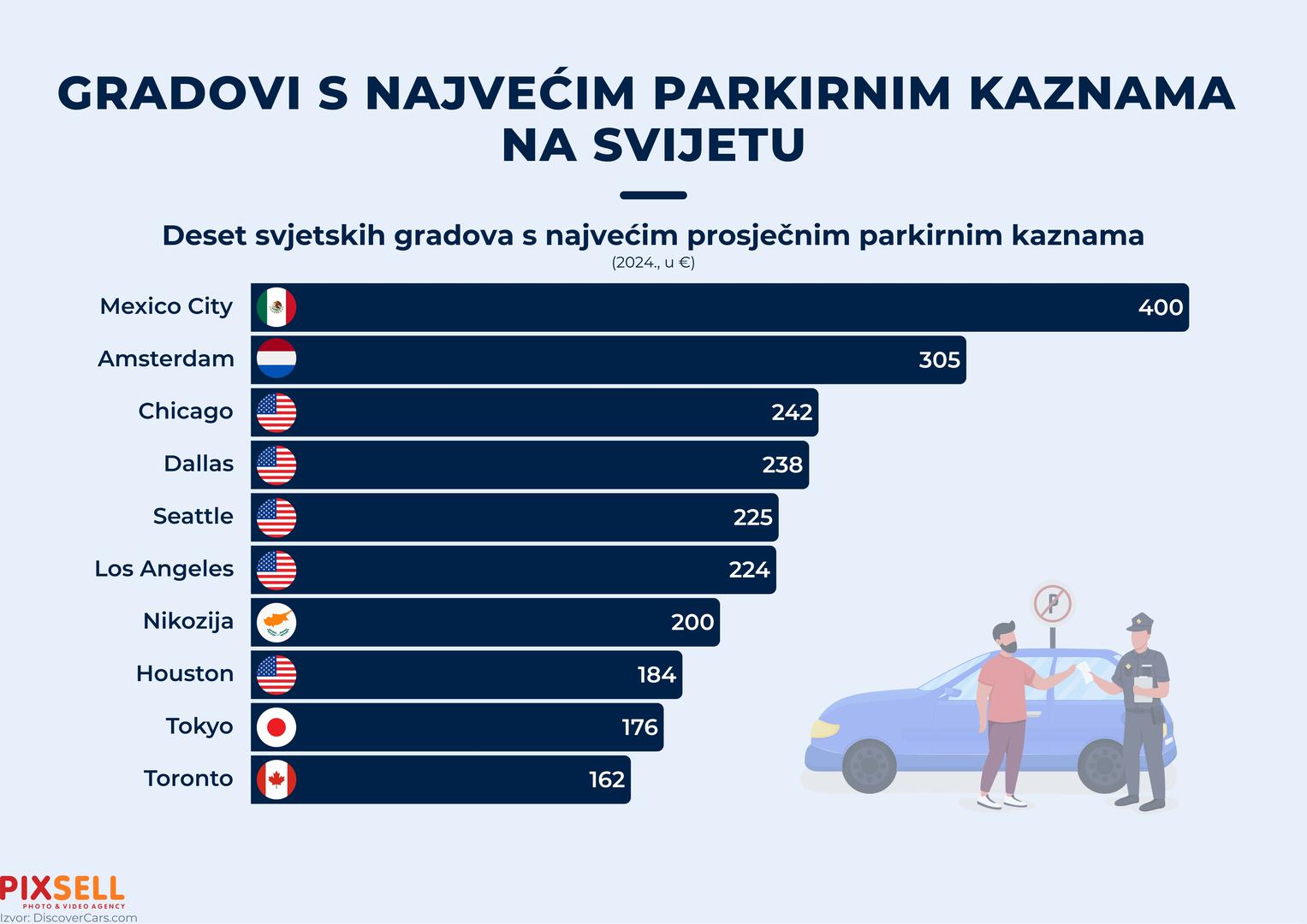 Ako ste tijekom 2024. godine nepropisno parkirali u Mexico Cityju, tada ste platili iznos od čak 400 eura, što je daleko najviše od bilo kojeg grada u svijetu. Kazne u Amsterdamu su 305 eura, a "najniža" kazna u top 10 je u Torontu - do 162 eura.