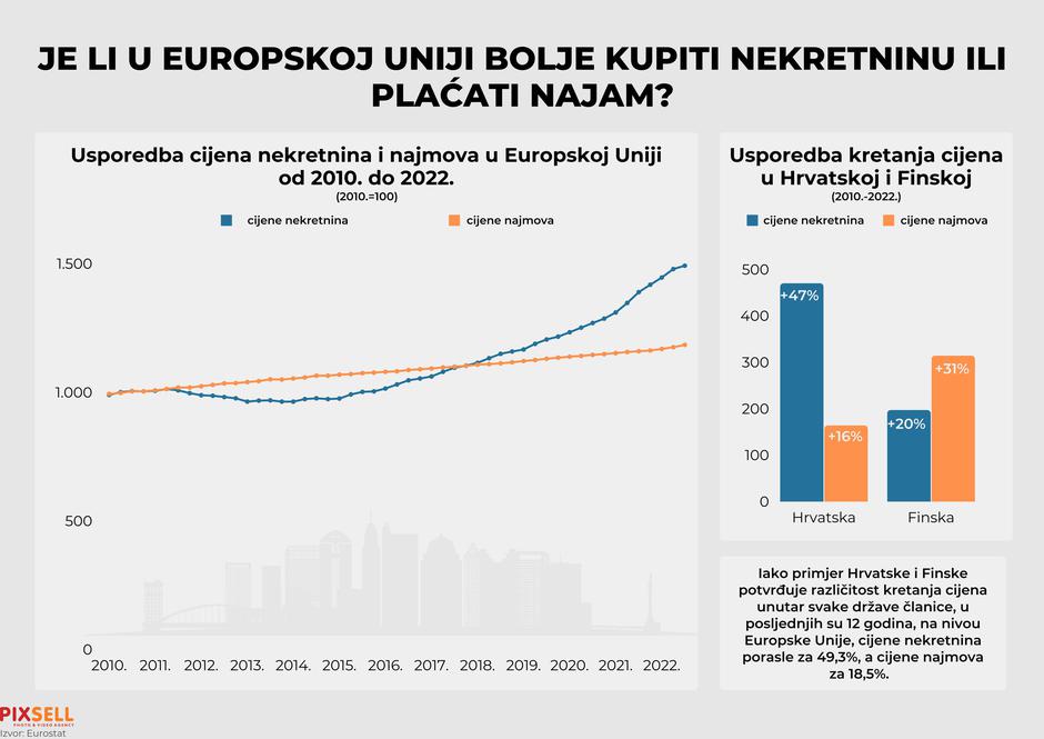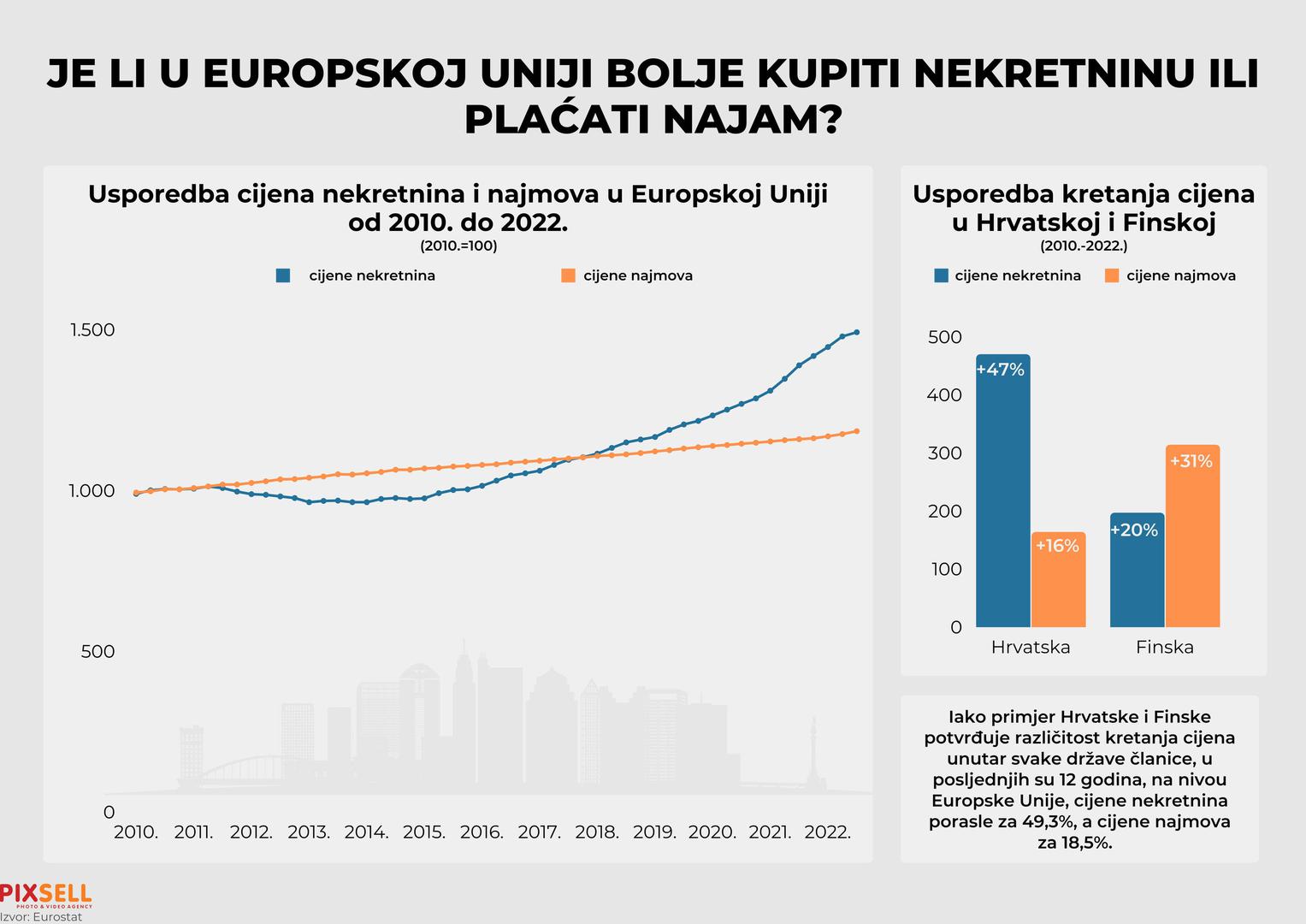 Foto i video agencija Pixell napravila je usporedbu cijena i najmova nekretnina u Europskoj uniji od 2010. do 2022. godine. Kao primjer, cijene nekretnina u Hrvatskoj porasle su za 47% dok je rast cijena u Finskoj iznosio 20%. Iako primjer Hrvatske i Finske potvrđuje različitost kretanja cijena unutar svake države članice, u posljednjih su 12 godina, na nivou Europske unije, cijene nekretnina porasle za 49,3%, a cijene najmova za 18,5%.