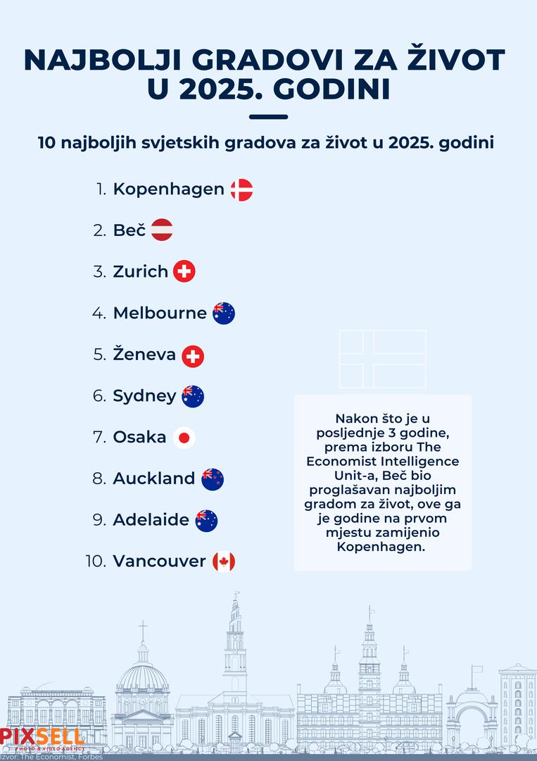Prema podacima The Economist Intelligence Unita, Kopenhagen je proglašen najboljim gradom za život u 2025. godini, čime je nakon tri godine s trona svrgnuo Beč, koji sada zauzima drugo mjesto. Na trećem mjestu nalazi se Zurich, dok slijede Melbourne, Ženeva i Sydney. U top 10 su još i Osaka, Auckland, Adelaide te Vancouver. Ova lista temelji se na kvaliteti života, infrastrukturi, obrazovanju, zdravstvu i sigurnosti, a uključuje gradove s različitih kontinenata, s naglaskom na Europu, Australiju i Aziju.