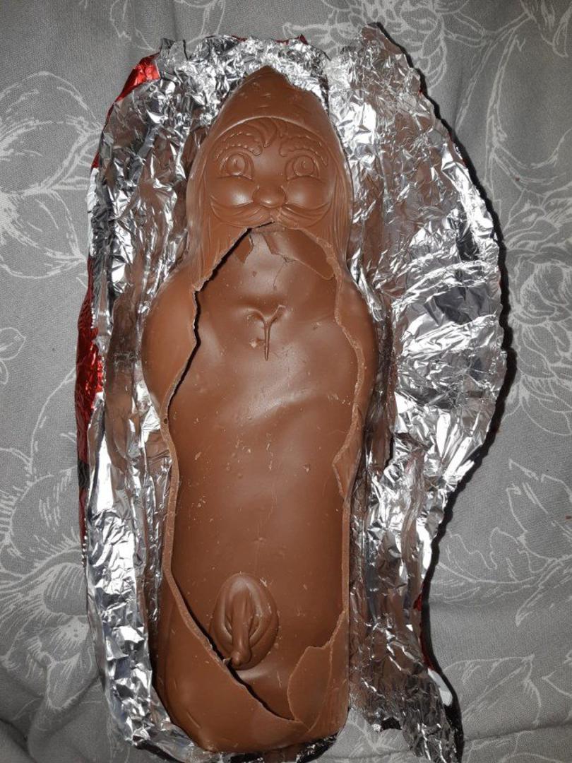 Kada je pojeo prednji dio čokolade u unutrašnjosti Djeda Božićnjaka nalazio se komad čokolade nalik na muški spolni organ. Čokolada se izlila baš u donjem dijelu figurice gdje bi se i trebala nalaziti pa je iznenađenje bilo još i veće. Mladić je odmah nazvao svoju djevojku, a par nije mogao doći k sebi od smijeha. Nakon toga su se našli i fotografirali čokoladu te su se javili trgovini kako bi ih 'upozorili' što prodaju.