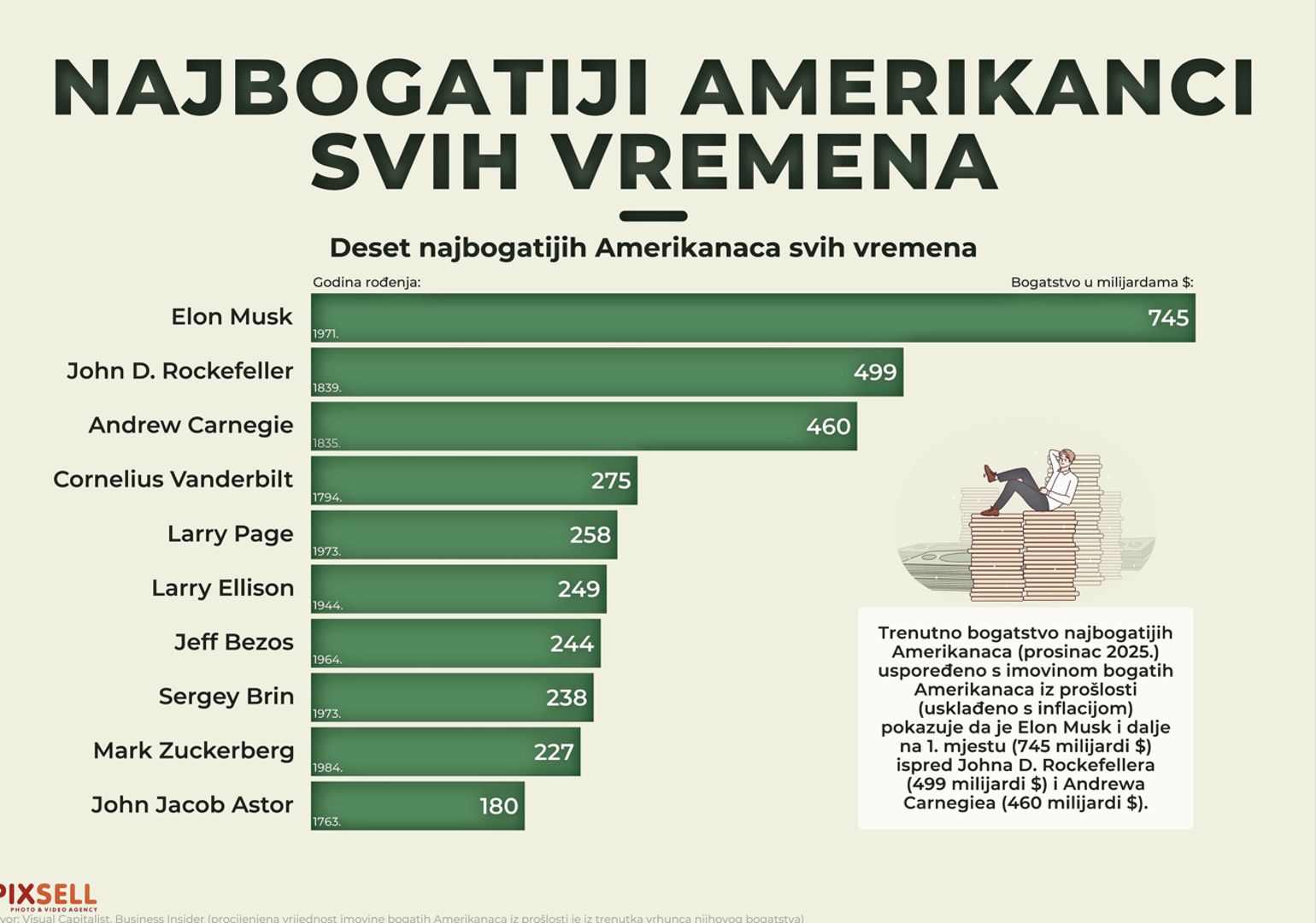 Infografika prikazuje listu deset najbogatijih Amerikanaca svih vremena, uz procijenjeno bogatstvo izraženo u milijardama dolara i godinu rođenja svakog od njih.