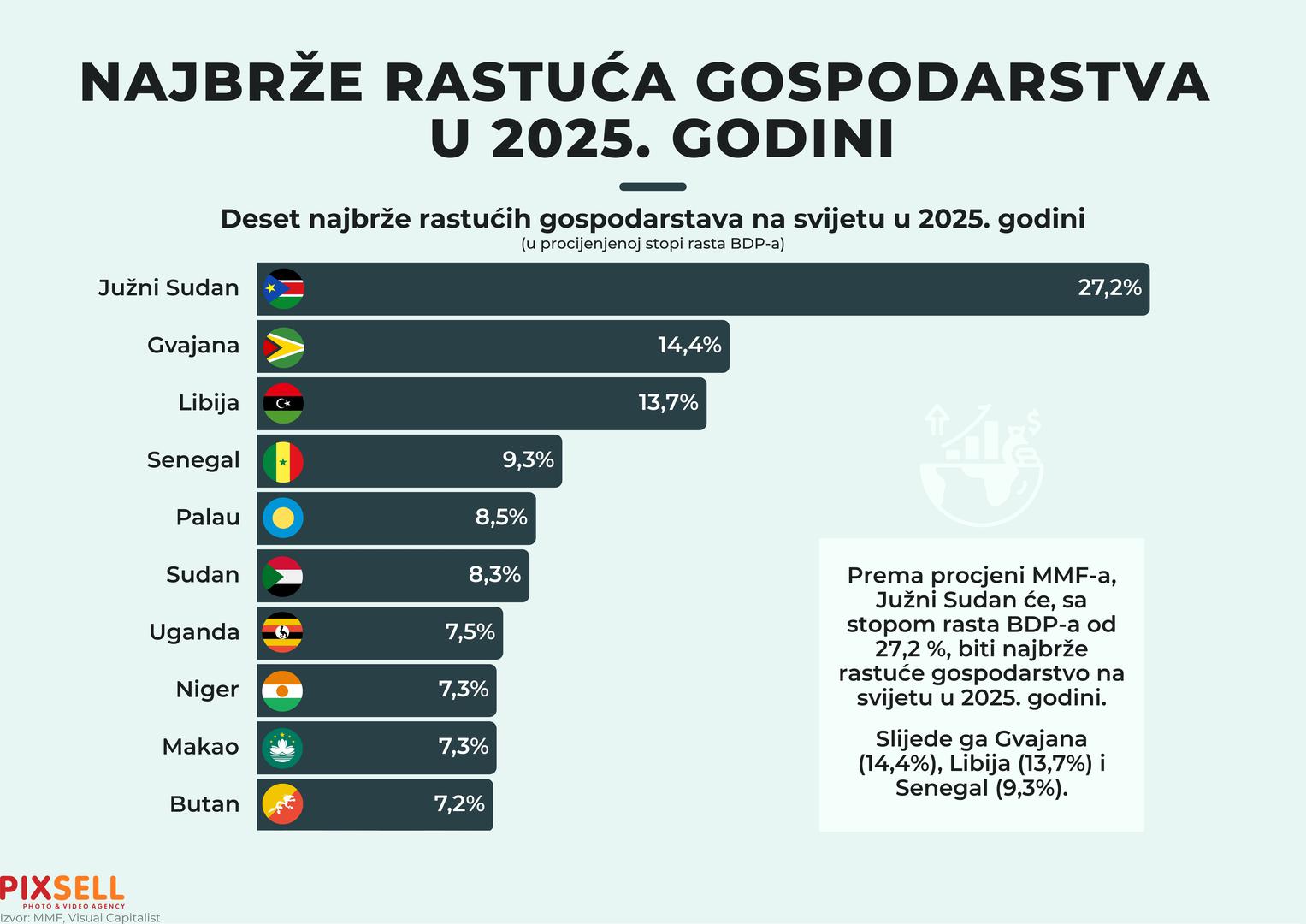 Prema procjeni MMF-a, Južni Sudan će, sa stopom rasta BDP-a od 27,2% biti najbrže rastuće gospodarstvo na svijetu u 2025. godini. Slijede ga Gvajana (14,4%), Libija (13,7%) i Senegal (9,3%).